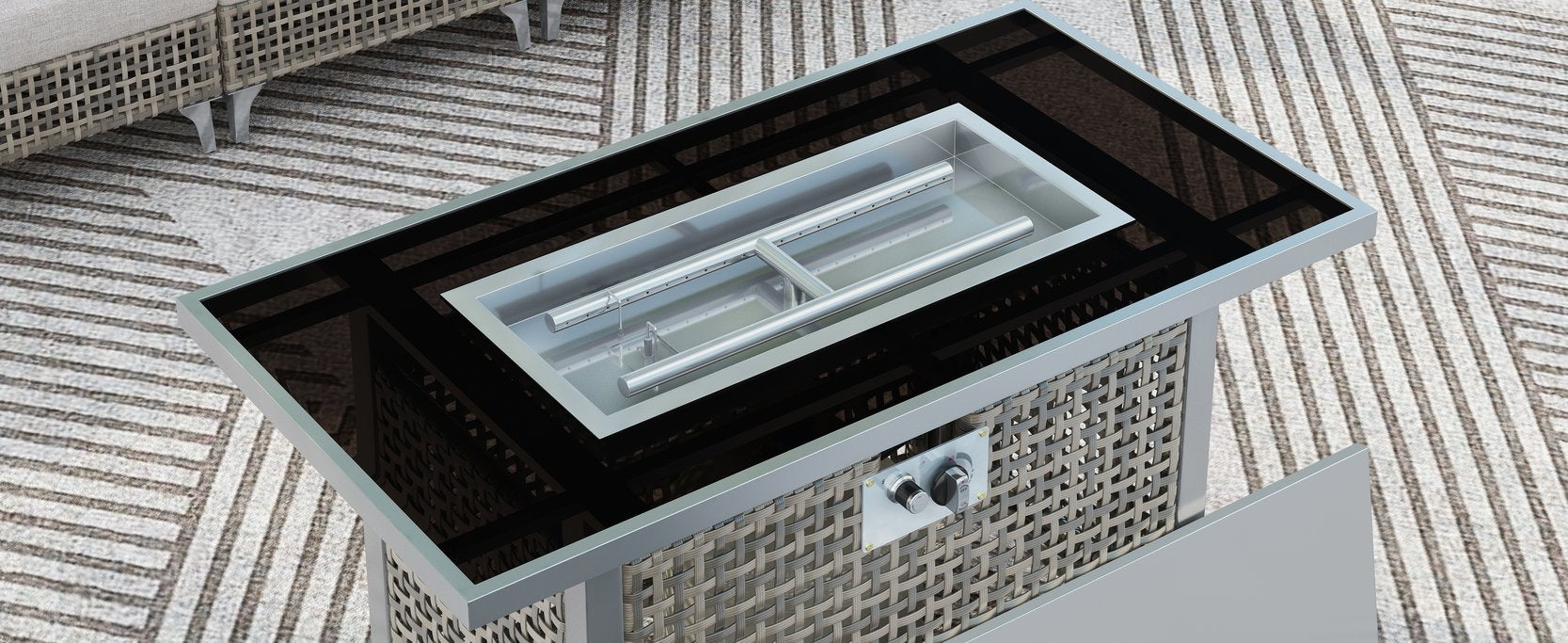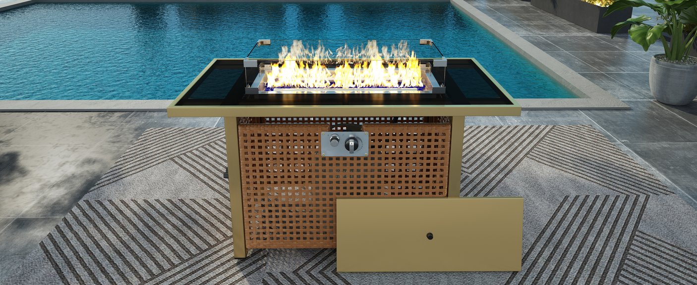 Bring cozy warmth and contemporary style to your outdoor living space with this 43" propane gas fire pit table. Designed for effortless entertaining, it combines a high-output stainless steel burner, durable all-weather wicker, and a tempered glass wind guard to deliver a safe, attractive focal point for patios, decks, and backyards. Convertible from a fire table to a dining or coffee surface, it’s engineered for year-round use and simple maintenance.