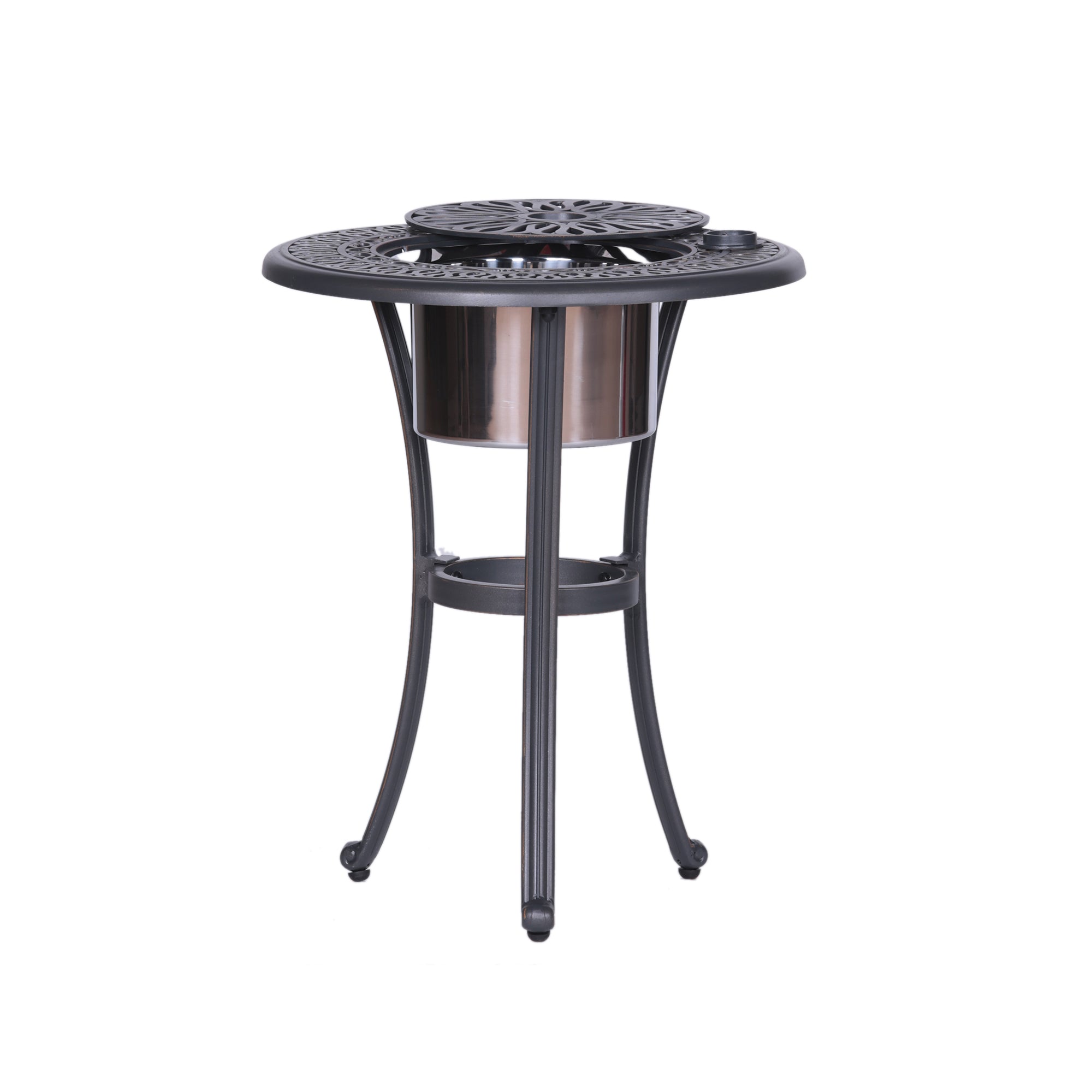 Bring convenience and style to your outdoor gatherings with this compact, multifunctional bistro/side table featuring a built-in ice bucket. Finished in gunmetal, the lightweight aluminum frame and patterned tabletop deliver a modern look that resists rust and stands up to outdoor use. Ideal for patios, decks, balconies, or poolside, it keeps drinks chilled while offering a stable surface for snacks or décor — easy to move where you need it.