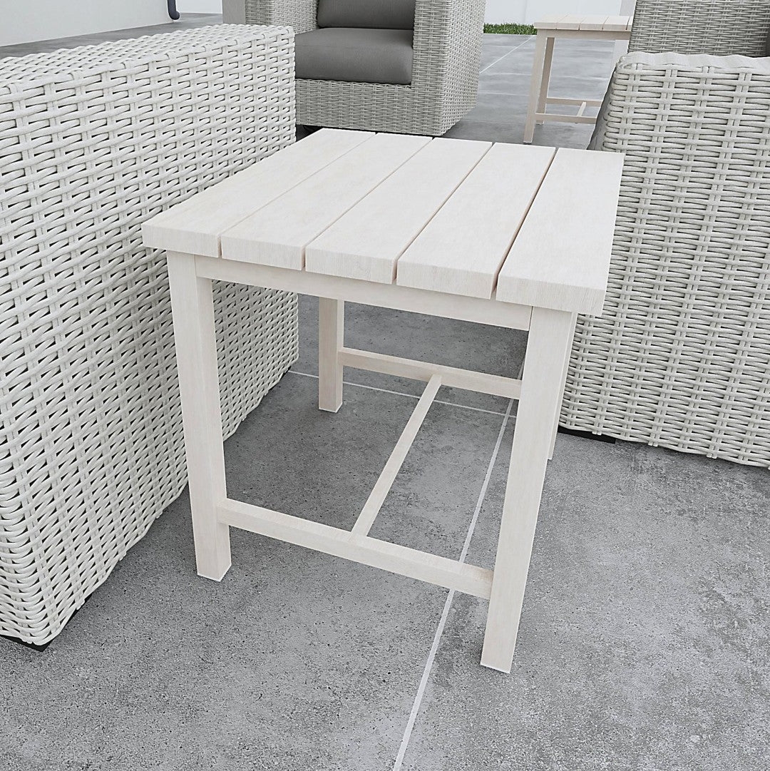 Bring effortless coastal charm and durable craftsmanship to your outdoor living space with this compact end table. Built from solid aluminum for weather resistance and finished in a light gray whitewashed birch look, it blends natural styling with low-maintenance performance—ideal for patios, porches, poolside areas, or as an accent piece indoors.