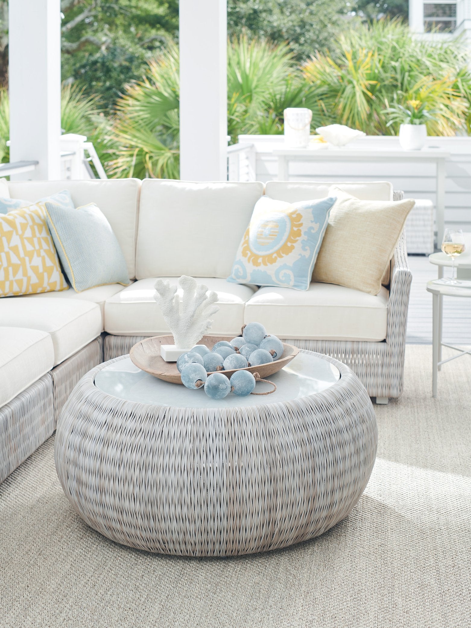 Elevate your outdoor living experience with the Seabrook collection's stylish round cocktail table. Designed to seamlessly blend elegance and functionality, this piece is perfect for entertaining guests or enjoying a quiet evening under the stars. The captivating oyster white finish and unique herringbone pattern of the all-weather wicker create a sophisticated aesthetic that complements a variety of outdoor settings. The artistic white glass top, featuring subtle tone-on-tone swirls, adds a touch of contemporary charm, making it a stunning centerpiece for your outdoor space.