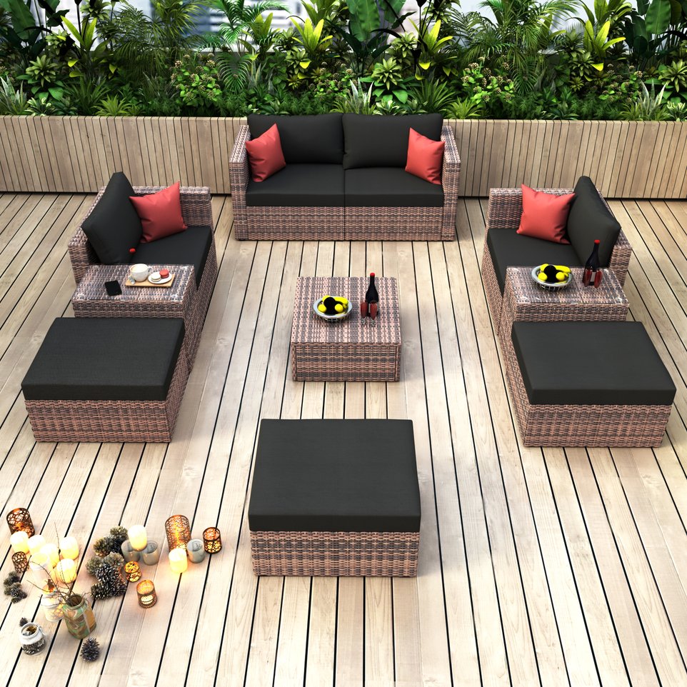 - Materials & finish: Weather-resistant brown wicker over a sturdy metal frame with high-end outdoor powder coating; cushions in black fabric with red accent pillows.
