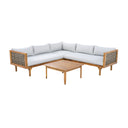 Bring comfort and style to your indoor or outdoor living area with this thoughtfully designed sectional seating group. Combining durable acacia wood, handwoven synthetic wicker, and waterproof light-gray cushions, this modular set delivers a refined look, weather-ready performance, and flexible arrangements to suit patios, sunrooms, balconies, or living rooms.
