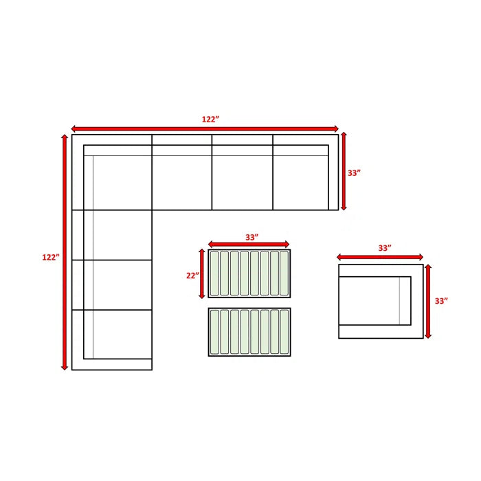 - Prominent Dimensions: Sofa: 26" H x 122" W x 122" D; Club Chair: 26" H x 33" W x 33" D; Coffee Table: 18" H x 22" W x 33" L; Cushion: 5" H x 28" D x 28" W; Seat Height: 18" from floor to cushion top. (Also listed product dimensions: 35.43 L x 24.02 W x 19.69 H.)