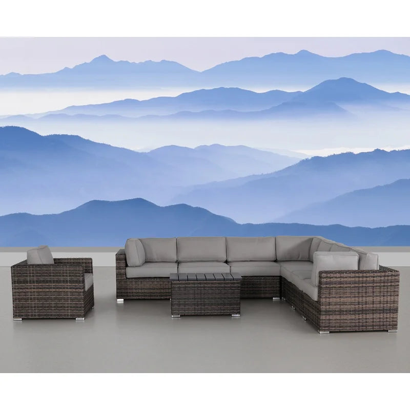 - Finish & Colors: Brown wicker frame and table with gray cushions for a versatile, modern aesthetic.