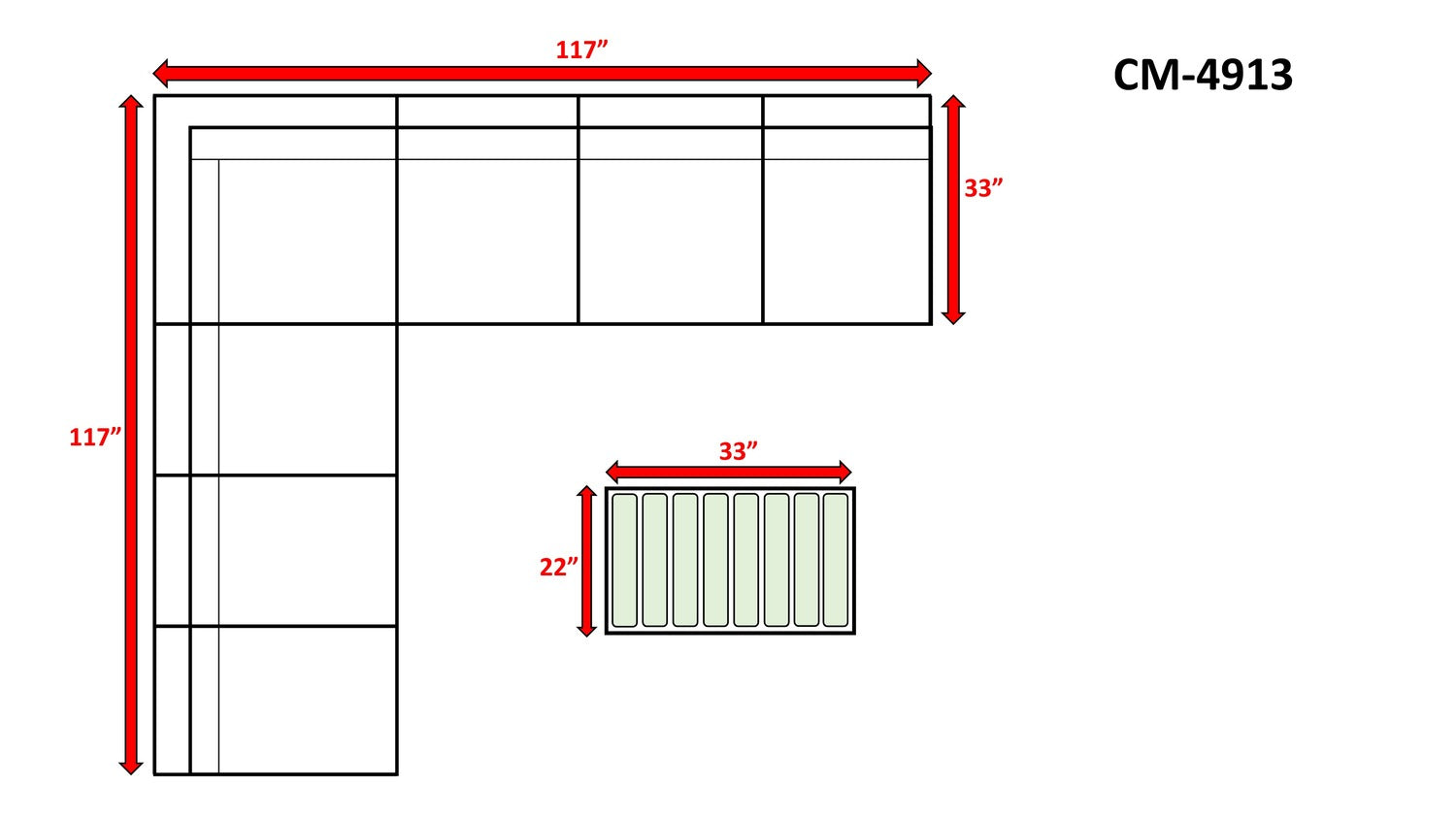 - Sofa (assembled layout): 26" H x 117" W x 117" D