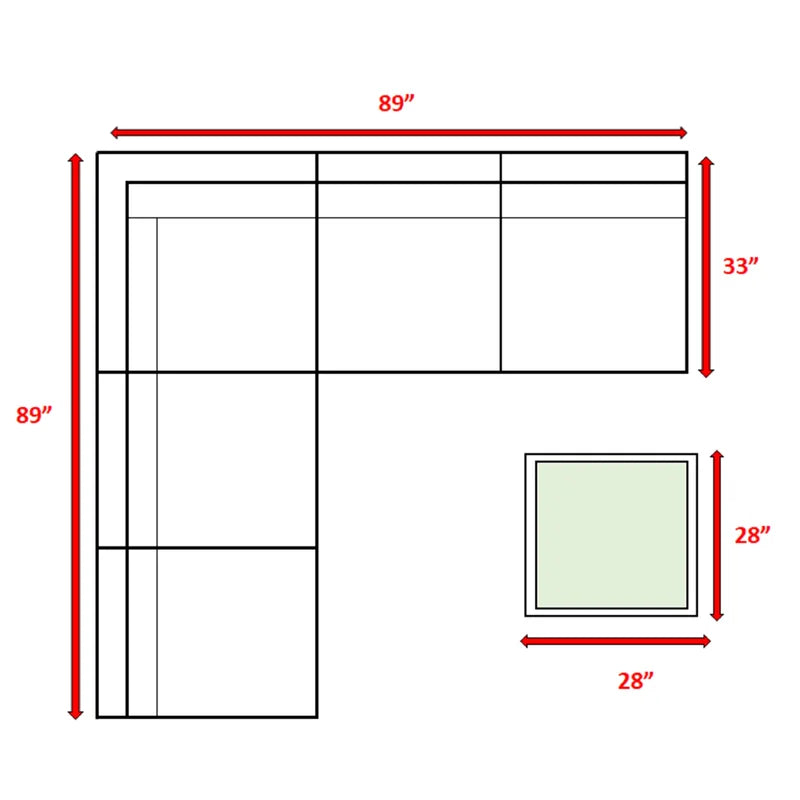 - Sofa: 26" H x 89" W x 89" D