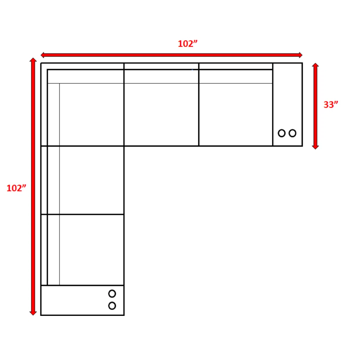 - Overall dimensions: 102" W x 102" D x 26" H (prominent)