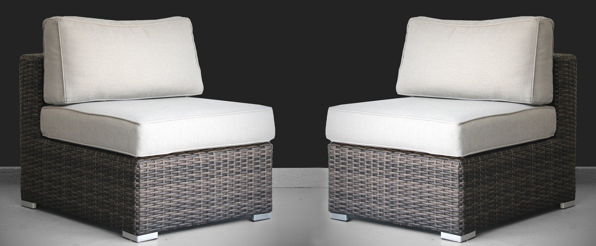 Refresh your outdoor living area with this elegant 2-piece armless sectional seating set, designed for modular versatility and everyday comfort. Crafted with a durable aluminum frame wrapped in all-weather HDPE wicker, these low-profile, boxy chairs provide a contemporary look that complements patios, decks, and garden lounges. Plush, removable cushions in Sunbrella or Olefin fabric deliver long-lasting comfort and easy care, while the fully assembled design makes setup effortless.