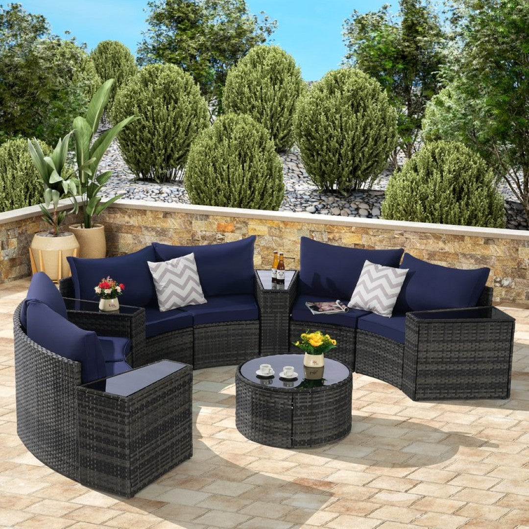 Create a welcoming, contemporary outdoor lounge with this 11-piece half-moon sectional set — designed for effortless entertaining, comfort, and low-maintenance durability. The modular curved pieces form a stylish round sofa that encourages conversation, while the tempered-glass coffee table provides a stable, elegant centerpiece. Built with weather-resistant materials and hand-woven craftsmanship, this set is ideal for patios, decks, poolside areas, and sunrooms.