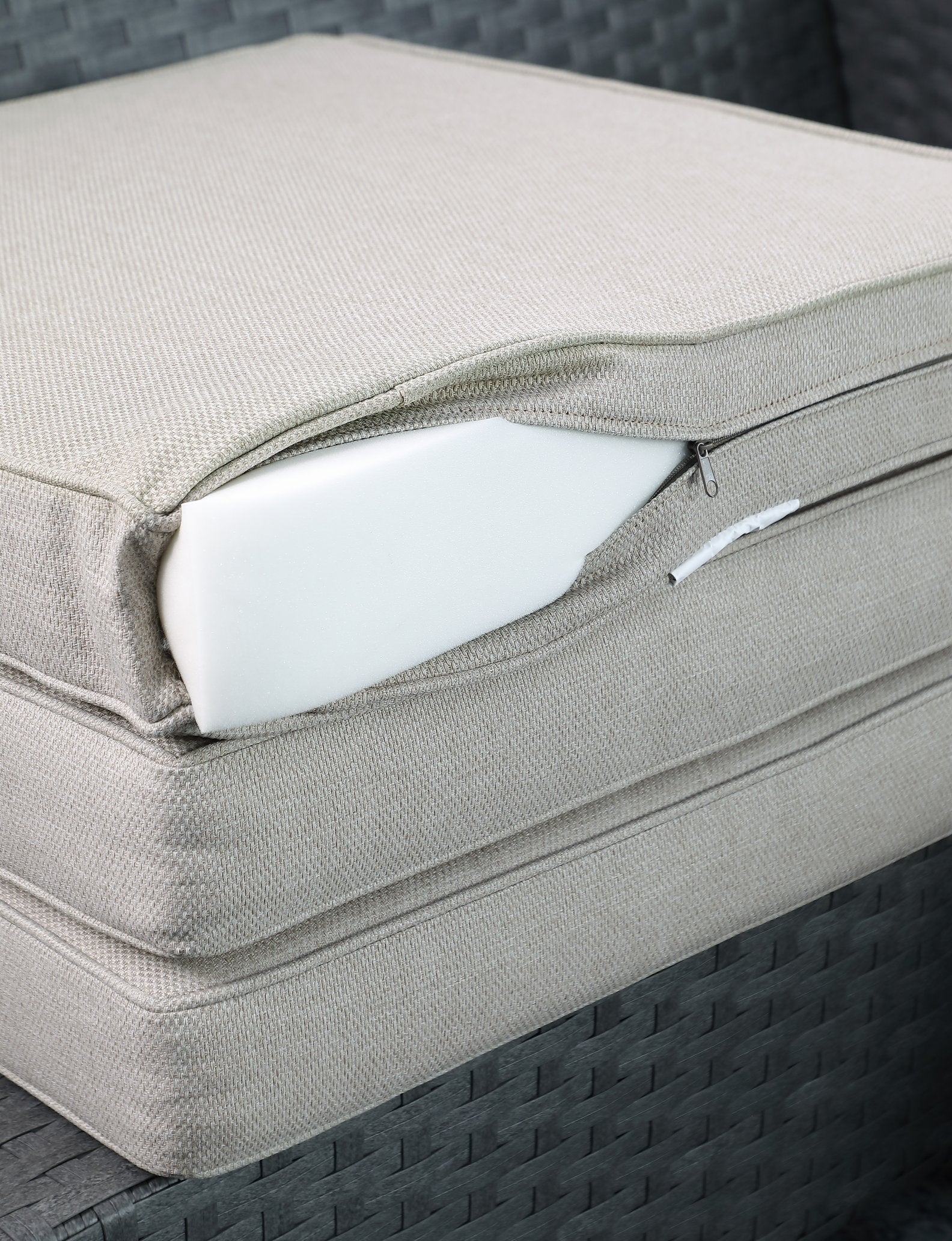- Cushions & Fabric: High-quality, UV-resistant fabric with zippered covers for easy removal and washing; thick sponge seat cushions and soft back cushions provide plush support.