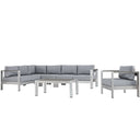 Refresh your outdoor living area with the Shore Outdoor Patio Sectional Sofa Set — a 6-piece ensemble that blends modern, low-maintenance design with durable construction for seasons of comfortable entertaining. Built on anodized brushed aluminum frames and fitted with weather-resistant canvas and plush cushions, this set offers versatile seating configurations for patios, decks, or poolside lounges while maintaining a clean, contemporary look.