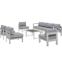 Experience relaxed, stylish outdoor living with the Shore Outdoor Patio Sectional Sofa Set by Modway. Crafted for durability and all-weather performance, this modular set combines anodized brushed aluminum frames with resilient, weather-tested fabric and thick, comfortable cushions to create a versatile seating solution for patios, decks, and backyard gatherings. Its clean lines and chic finish make it easy to arrange for intimate conversations or larger social settings, while non-marking foot caps protect surfaces and ensure stable placement.