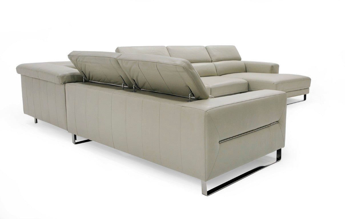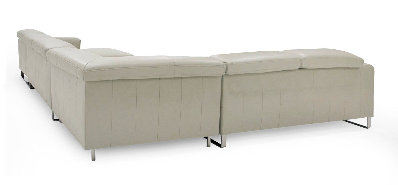 Elevate your living space with the Hawkey — a contemporary oversized sectional that blends modern design with everyday comfort. Fully upholstered in light grey leather, this versatile RAF chaise configuration offers generous seating for family and guests while delivering refined details like stainless steel sleigh legs and tuxedo-arm trim. Designed for relaxation and style, the Hawkey provides adjustable headrests and slide-out seats for customizable comfort without sacrificing its clean, sophisticated silhouette.