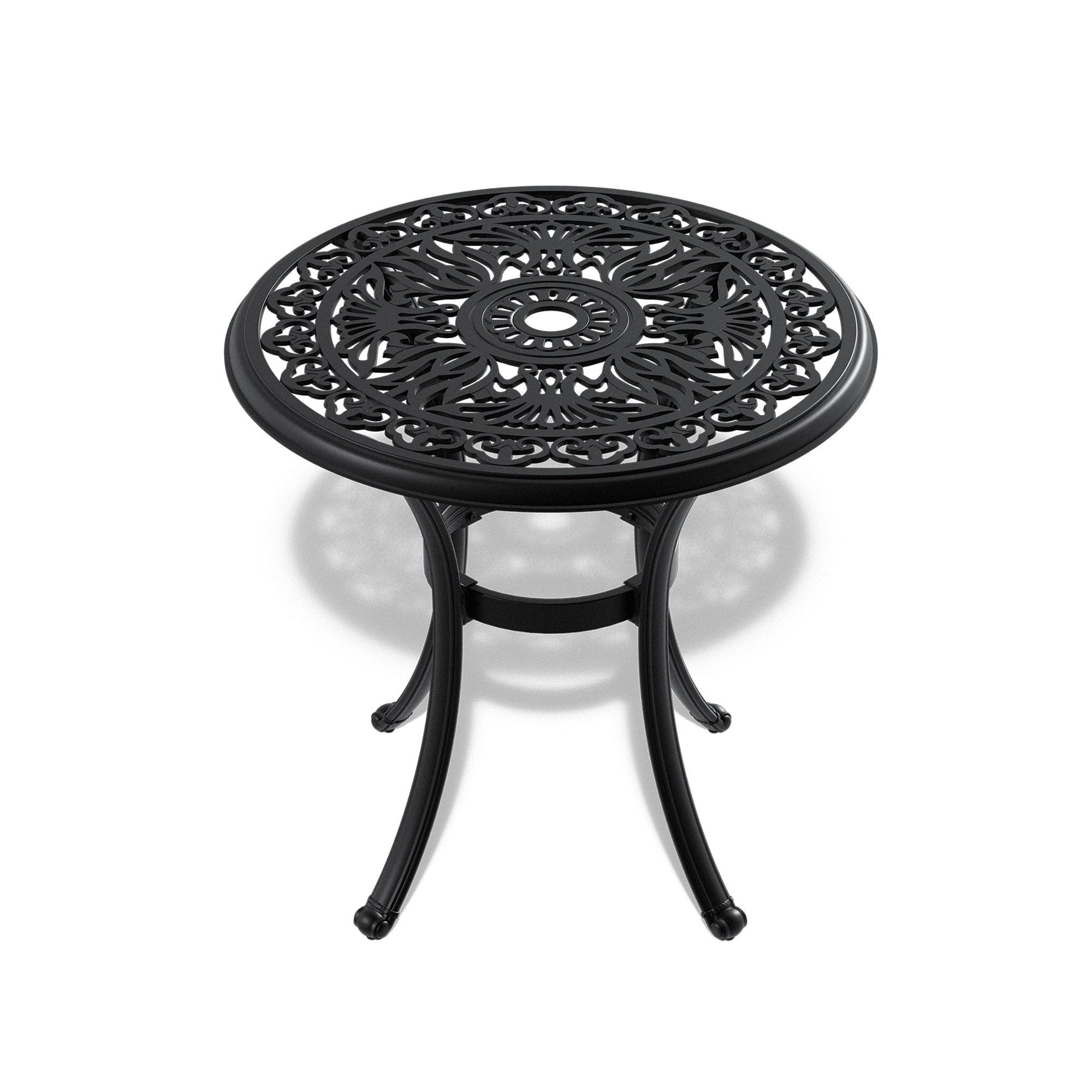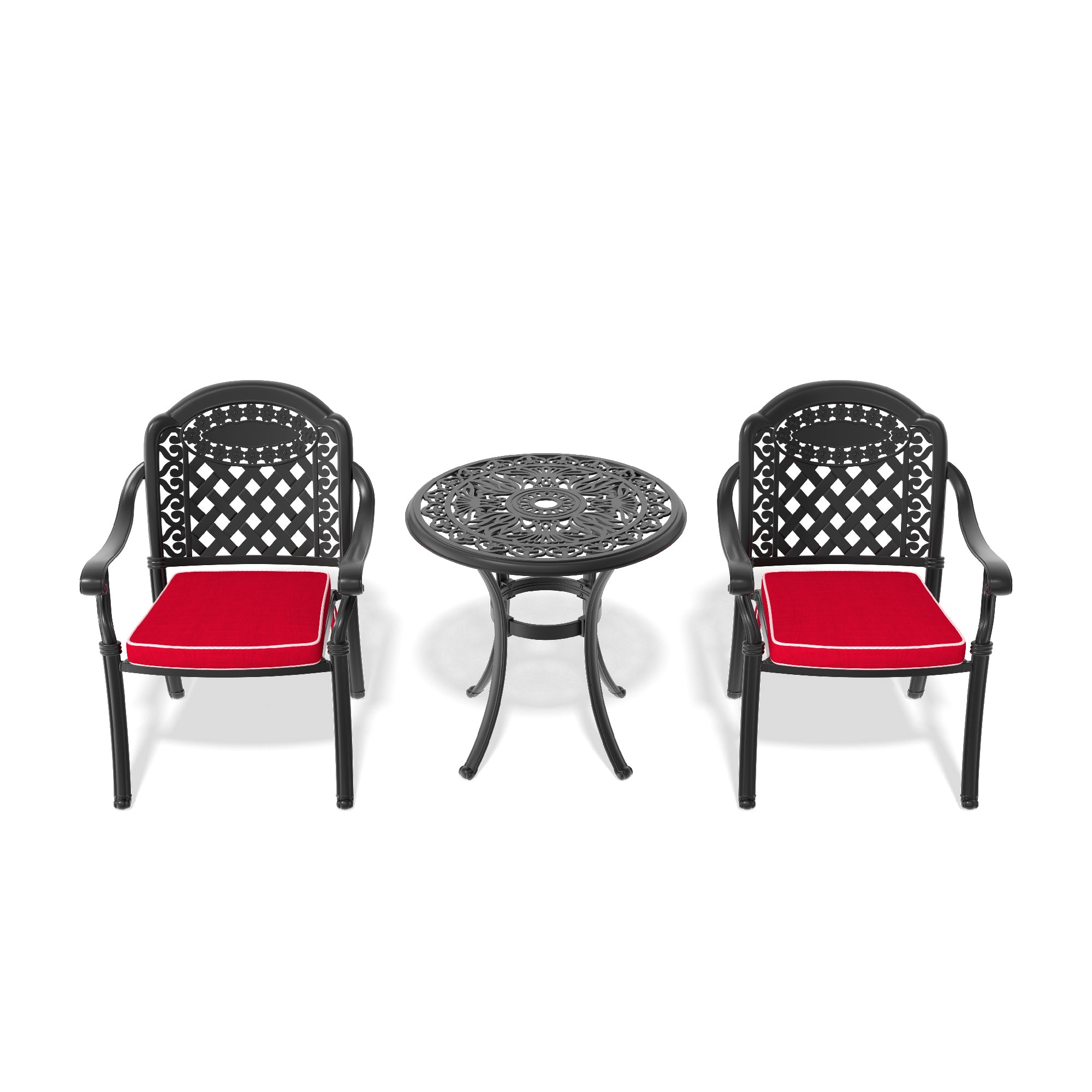 Enjoy relaxed outdoor dining with this durable 3-piece cast aluminum patio set — designed for style, comfort, and low maintenance. The compact round table and two stacking chairs offer a space-saving solution for balconies, patios, or small gardens, while included cushions (colors vary) enhance comfort and visual interest. Built to withstand the elements, this set combines a sturdy black aluminum frame with practical features like an umbrella hole and easy assembly.