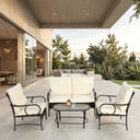 - Set composition: 1 steel-top table, 2 single chairs, 1 double (love) seat — includes 4 seat cushions and 4 back cushions.