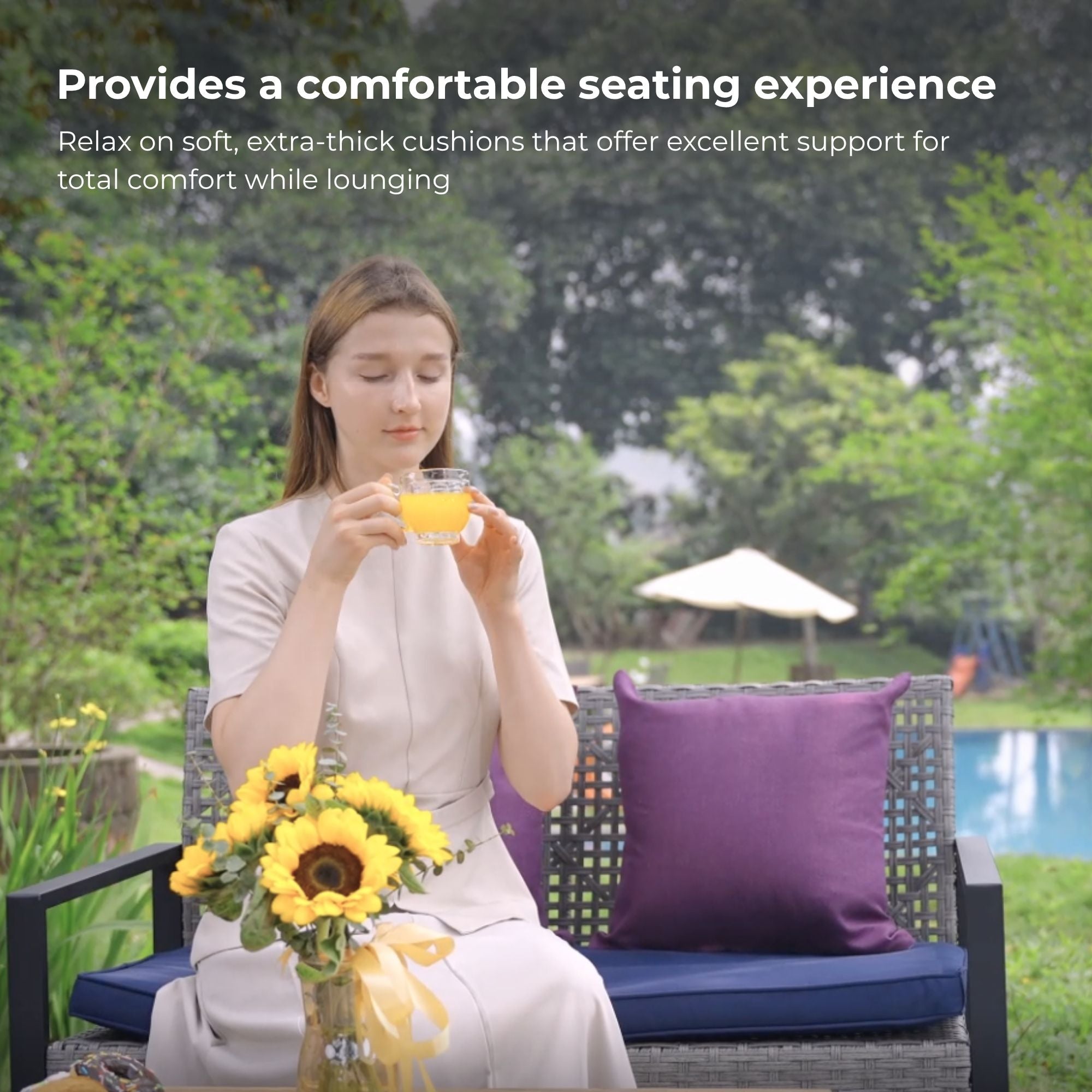 - DURABILITY MATERIAL: Durable and weather-resistant materials hold up to the elements; anti-rust and anti-corrosion treatment thanks to qualified polyester rattan, high-quality powder coating frame, UV tested cushion cover and acacia wood with water-based oil protection.