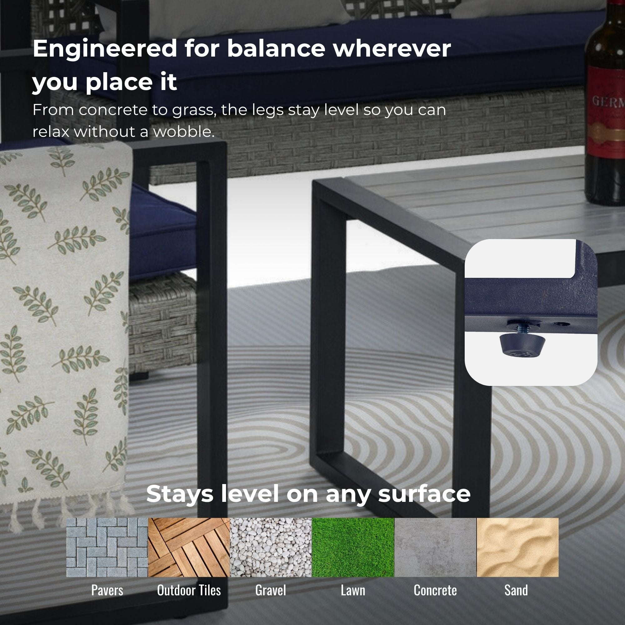 - Comfort-focused seating: Ergonomically designed double and single chairs with plush blue, UV-tested cushion covers for prolonged outdoor use. Each chair leg has adjustable levelers for stable seating on uneven surfaces.