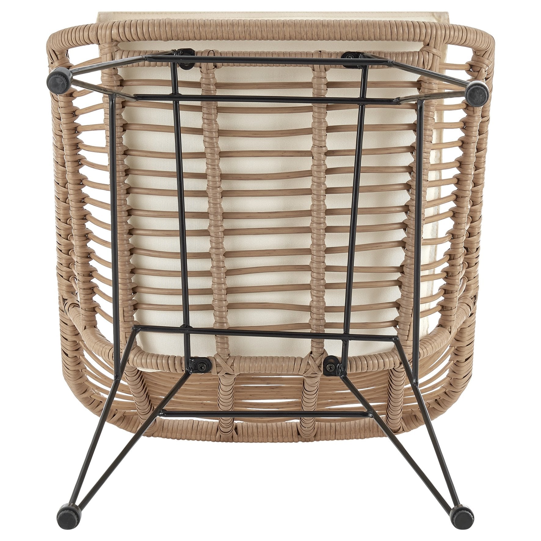 - Materials: Steel frame wrapped in weather-resistant PVC rattan; geometric metal wired legs for visual interest and stability; removable tempered 5mm glass on the table.