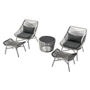- Set Includes: 2 lounge chairs, 2 accent ottomans, 1 end table (5-piece conversation set).