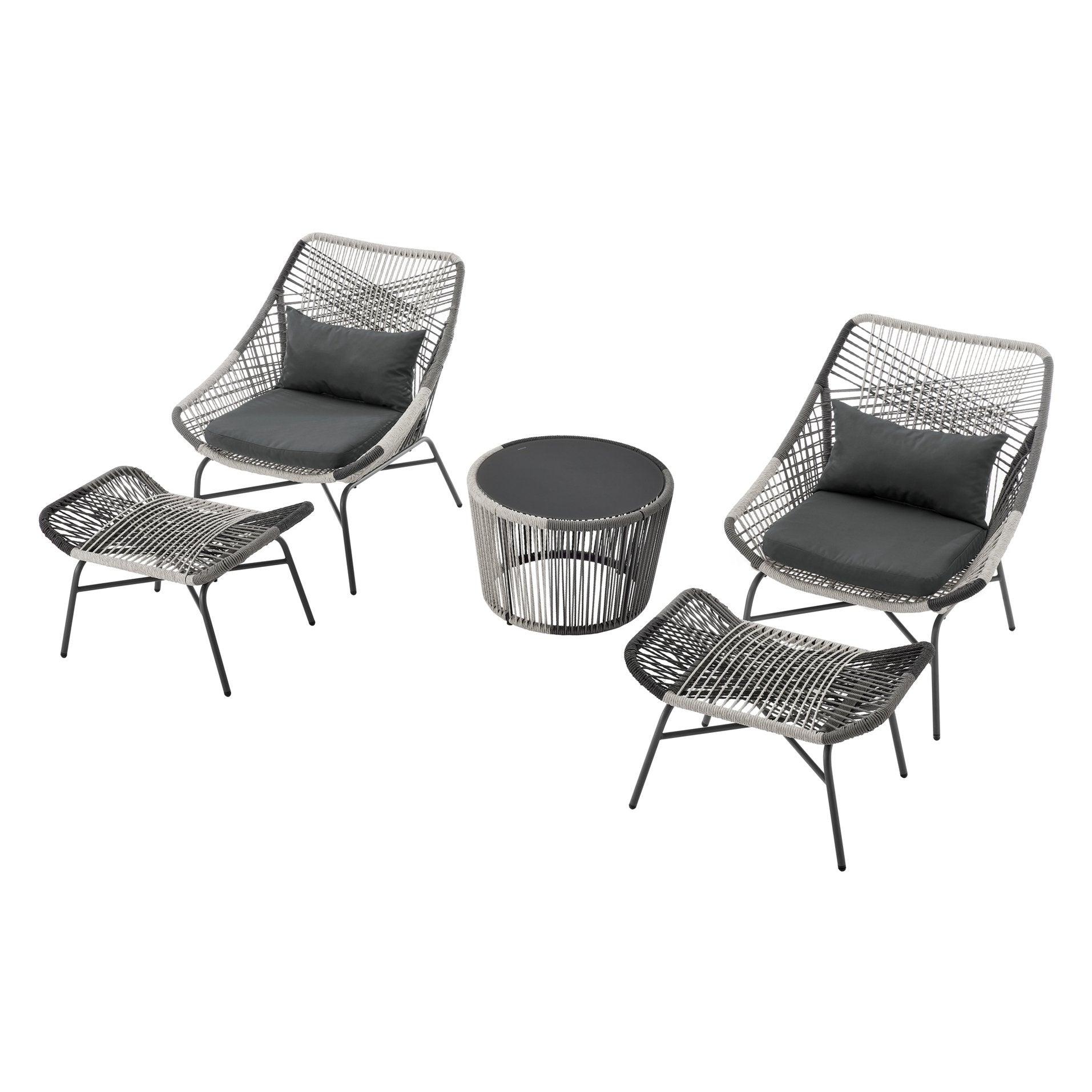 - Modern 5-Piece Outdoor Conversation Patio Set with 2 Chairs, 2 Foot Ottomans, and 1 Coffee Table.