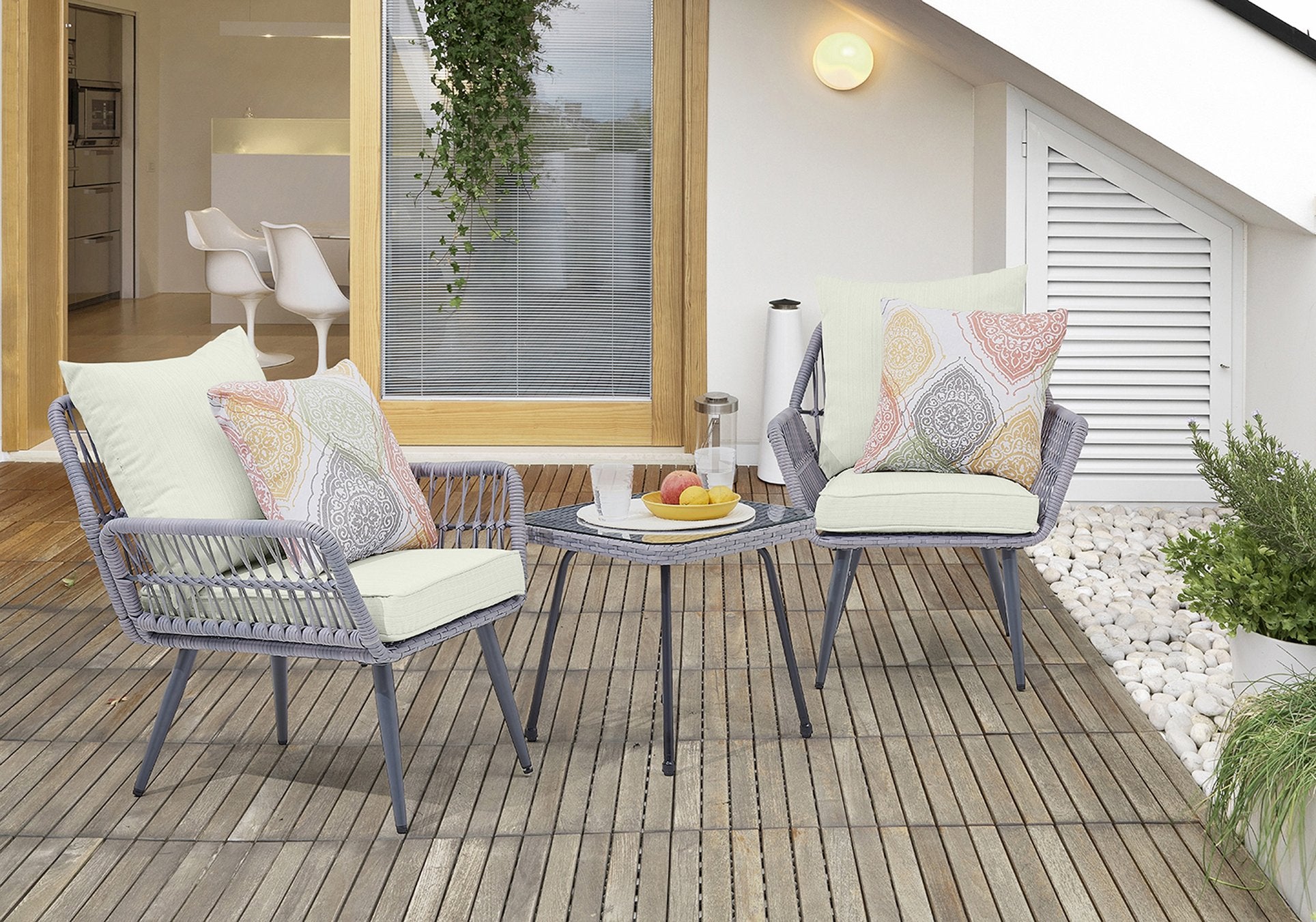 Transform your outdoor space into a cozy, contemporary retreat with this 3-piece Cannes conversation set. Designed for relaxed gatherings and everyday outdoor living, the set combines weather-resistant materials, comfortable removable cushions, and a sleek rounded-table design to offer both style and function for patios, balconies, and poolside lounges.
