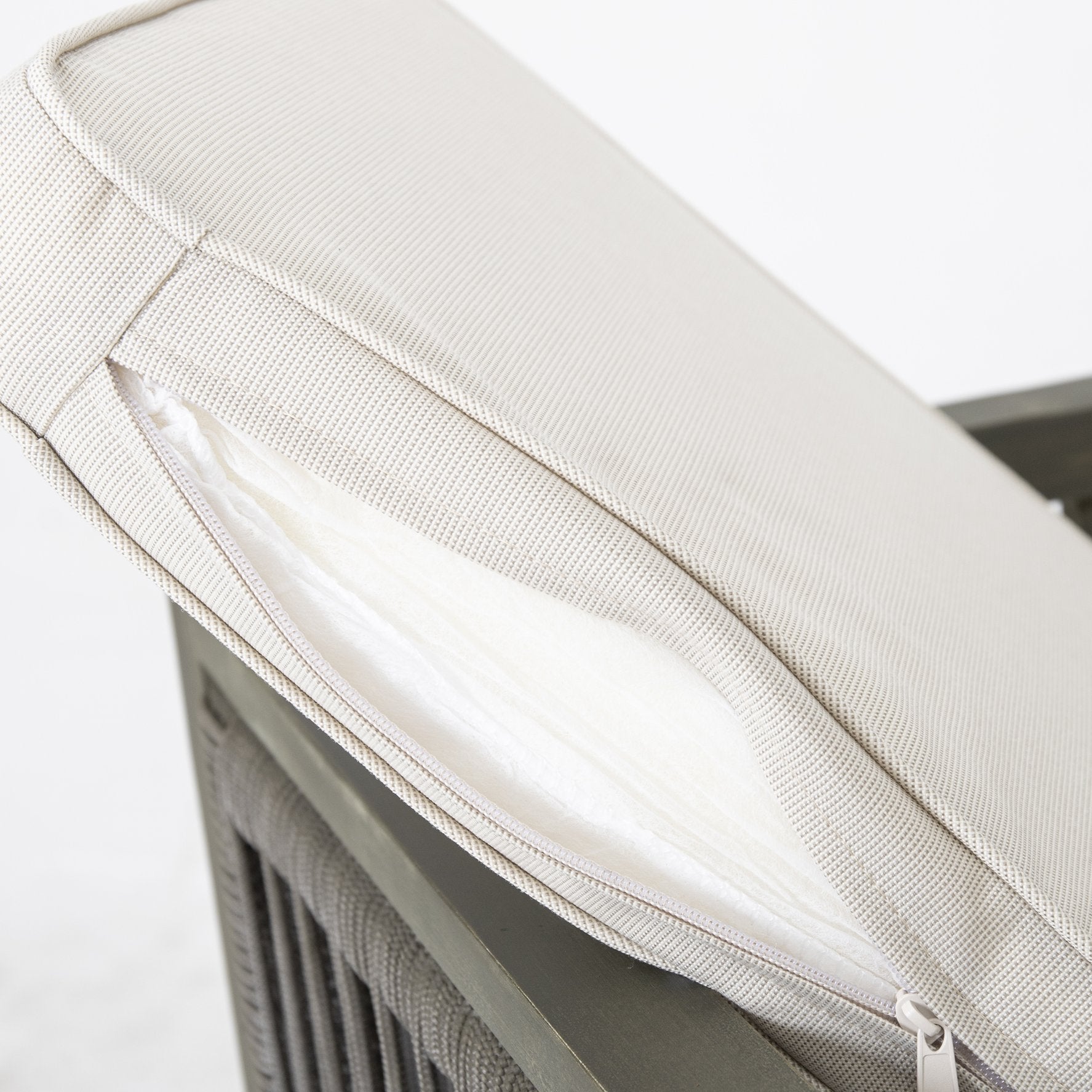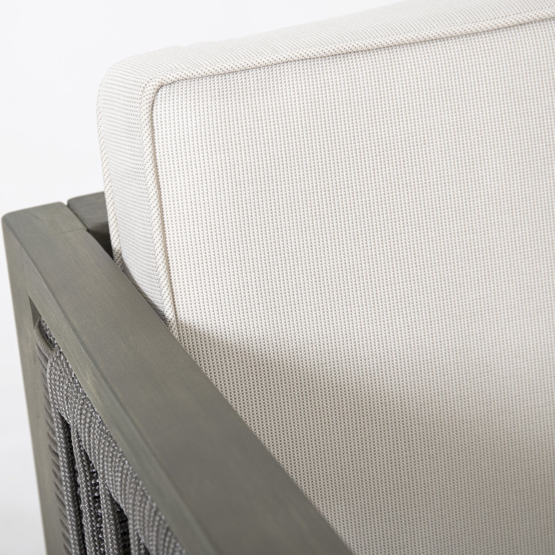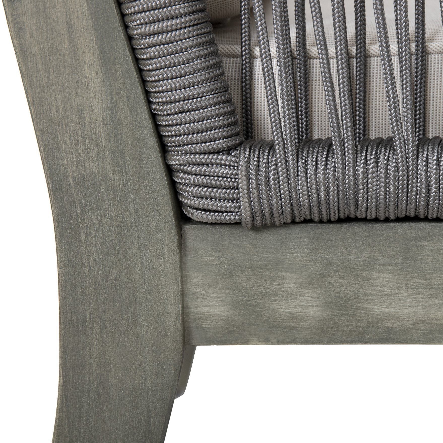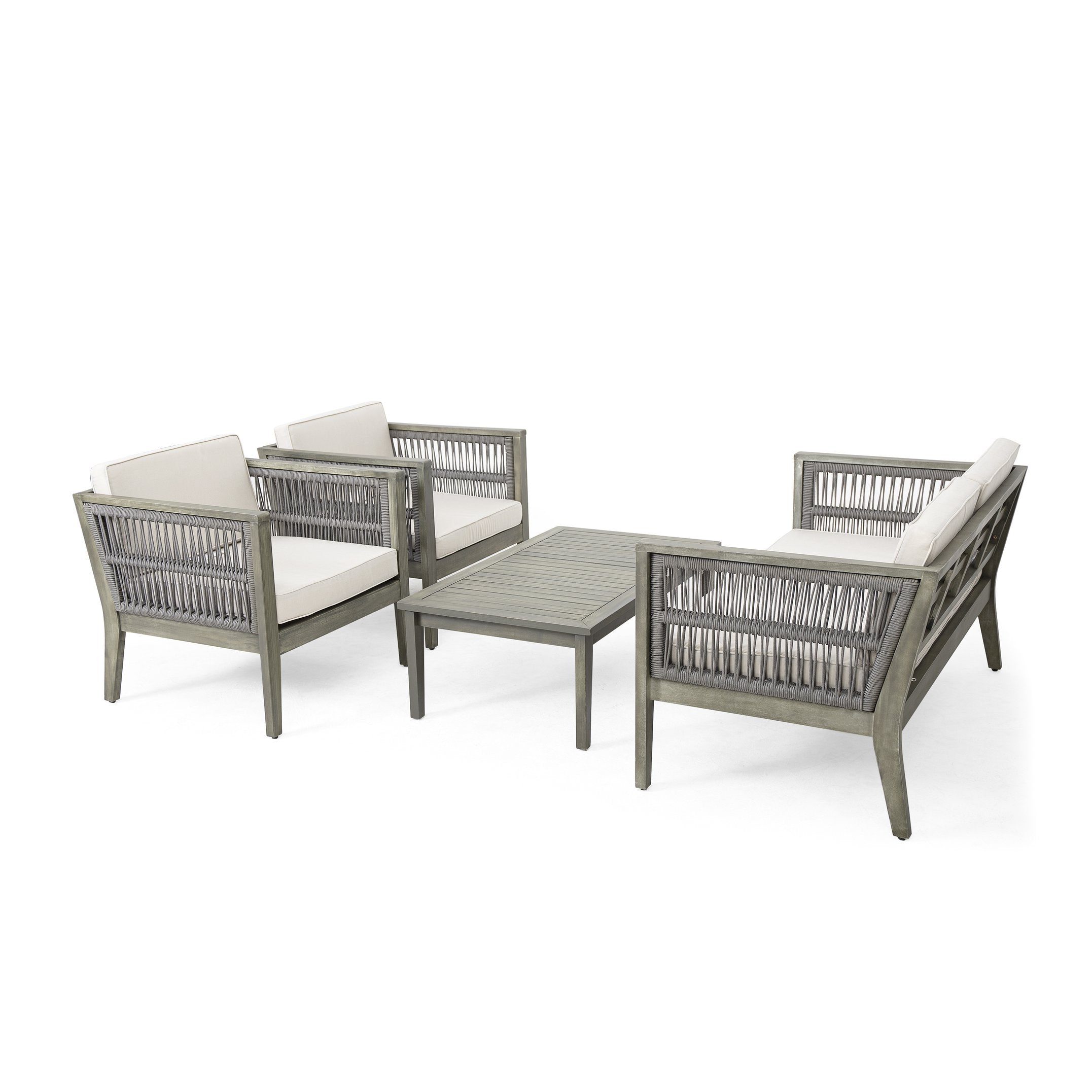 - Materials & Finish: Solid acacia wood frame and slatted tabletop, durable grey braided rope accents, olefin fabric removable cushion covers, and high-density sponge cushions in beige.