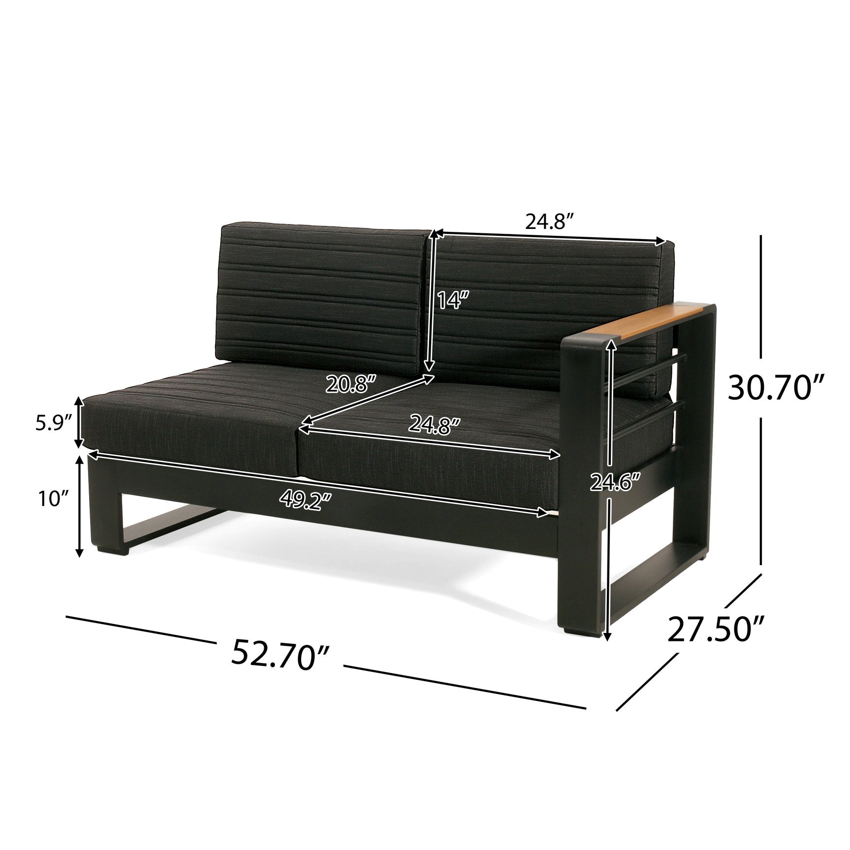 Refresh your outdoor living area with the Giovanna V Shaped Sofa set — a sleek, contemporary collection crafted from durable aluminum and designed for comfort, style, and easy maintenance. Water-repellent cushions make upkeep simple, while the elegant slat paneling and open backrest add a refined, airy aesthetic that complements modern patios, decks, and sunrooms.