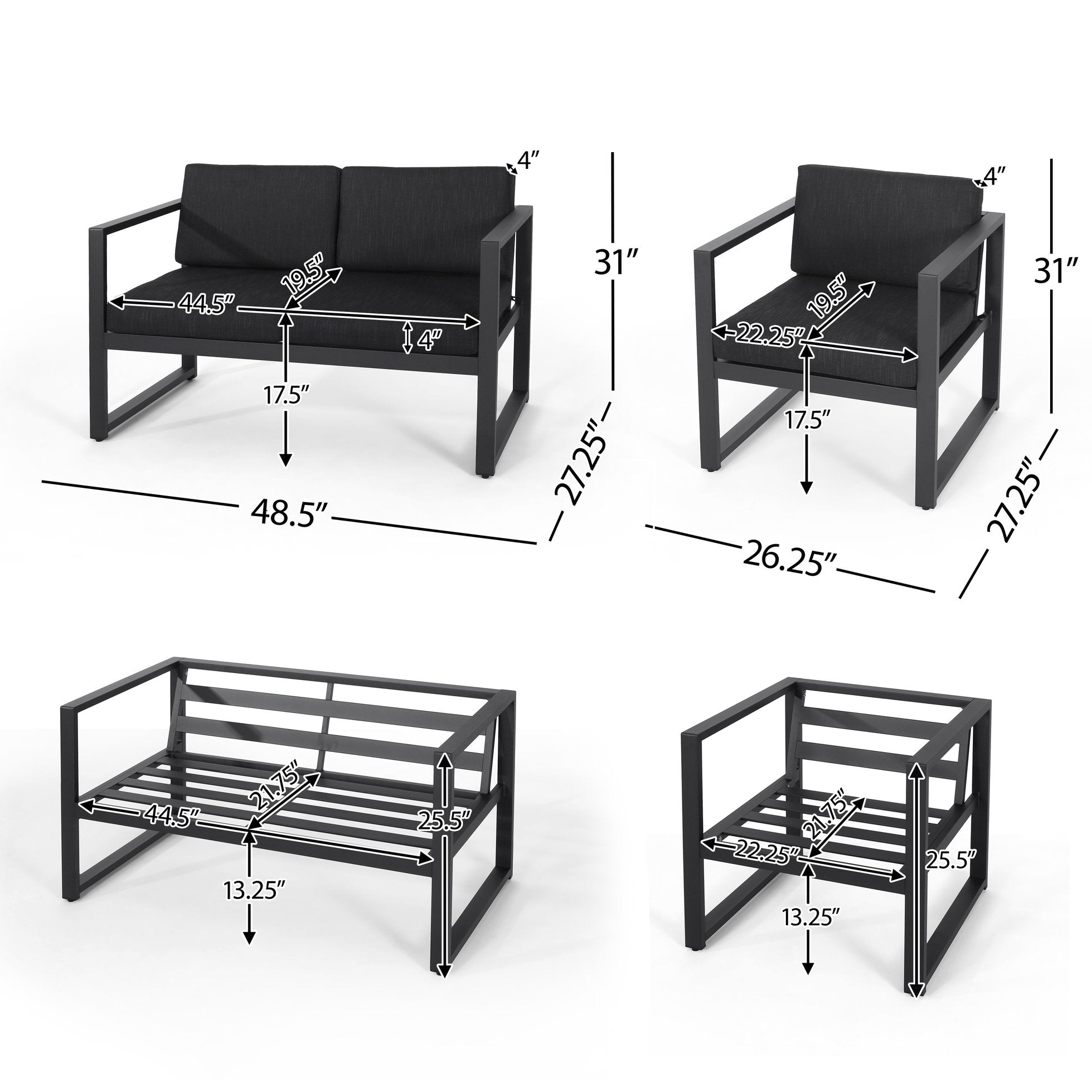- This rust-proof aluminum framed chat set is the perfect addition to any patio or backyard. Complete with a loveseat and two club chairs, this set has it all. With extra plush cushions for comfort, this set is sure to be a fan favorite amongst your friends and family. Add a cover for those rainy days and this set will last you all year long.