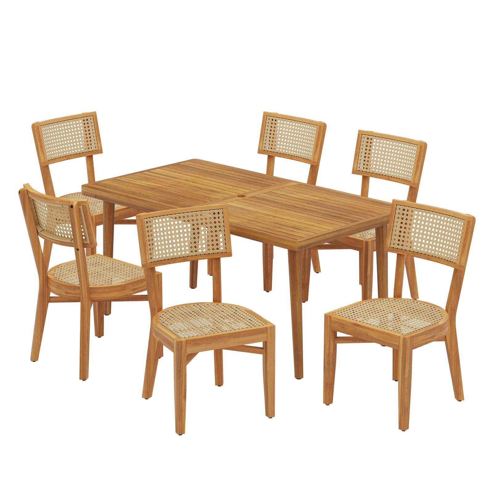 Enjoy relaxed outdoor dining with this 7-piece patio set that pairs durable acacia wood with weather-resistant wicker for a stylish, comfortable, and low-maintenance solution for your deck, patio, or balcony. The set’s natural tones and clean lines create a warm, inviting atmosphere for everyday meals or weekend gatherings.