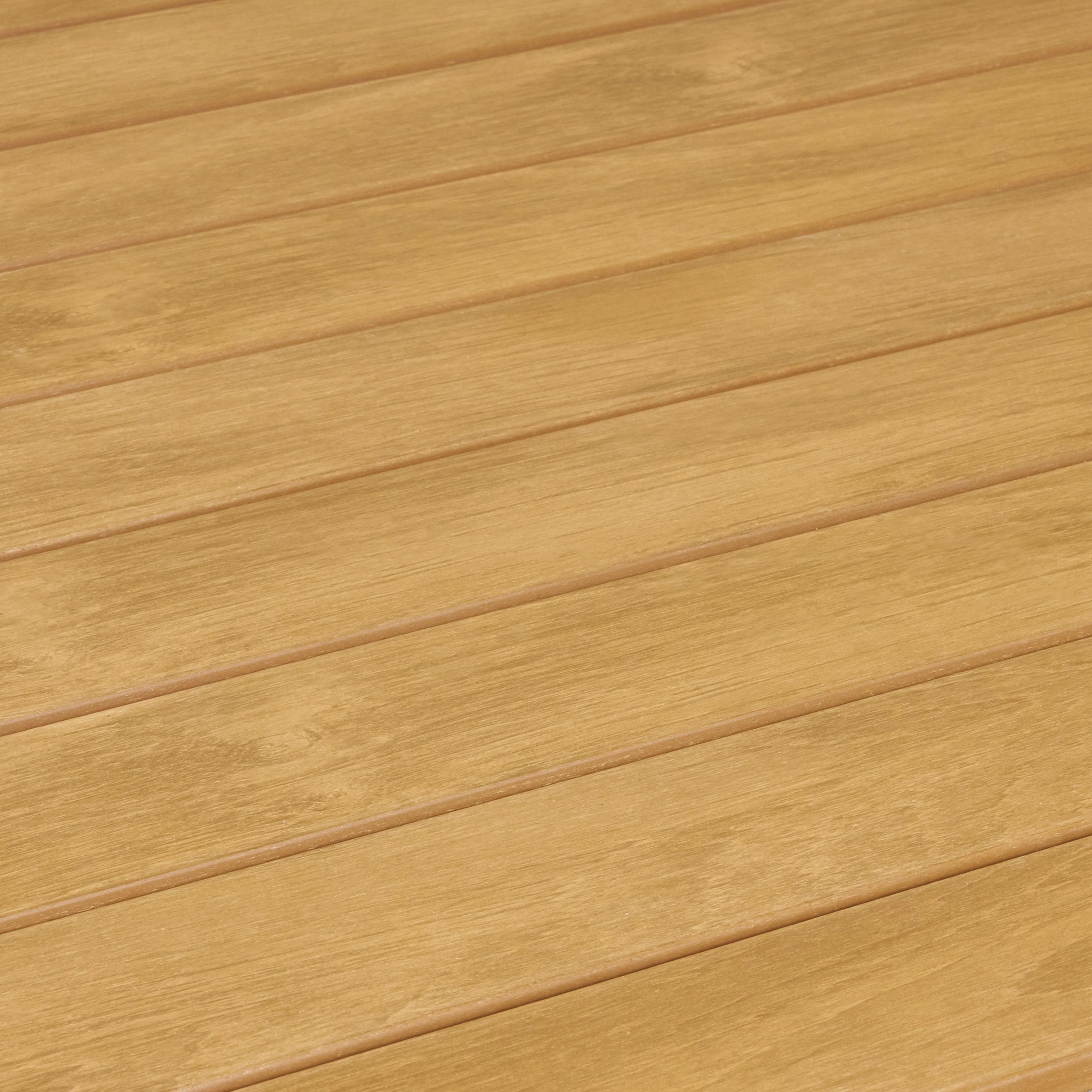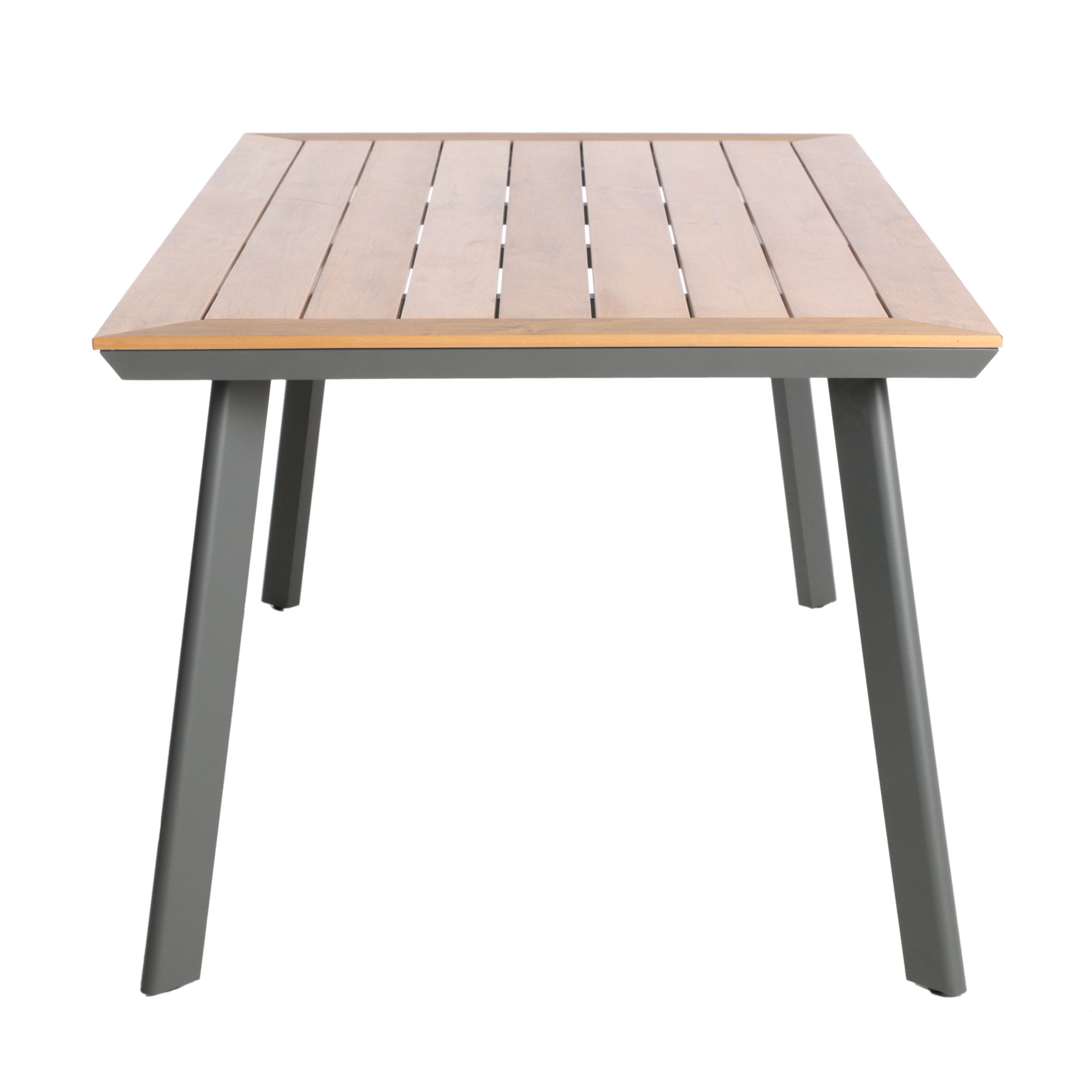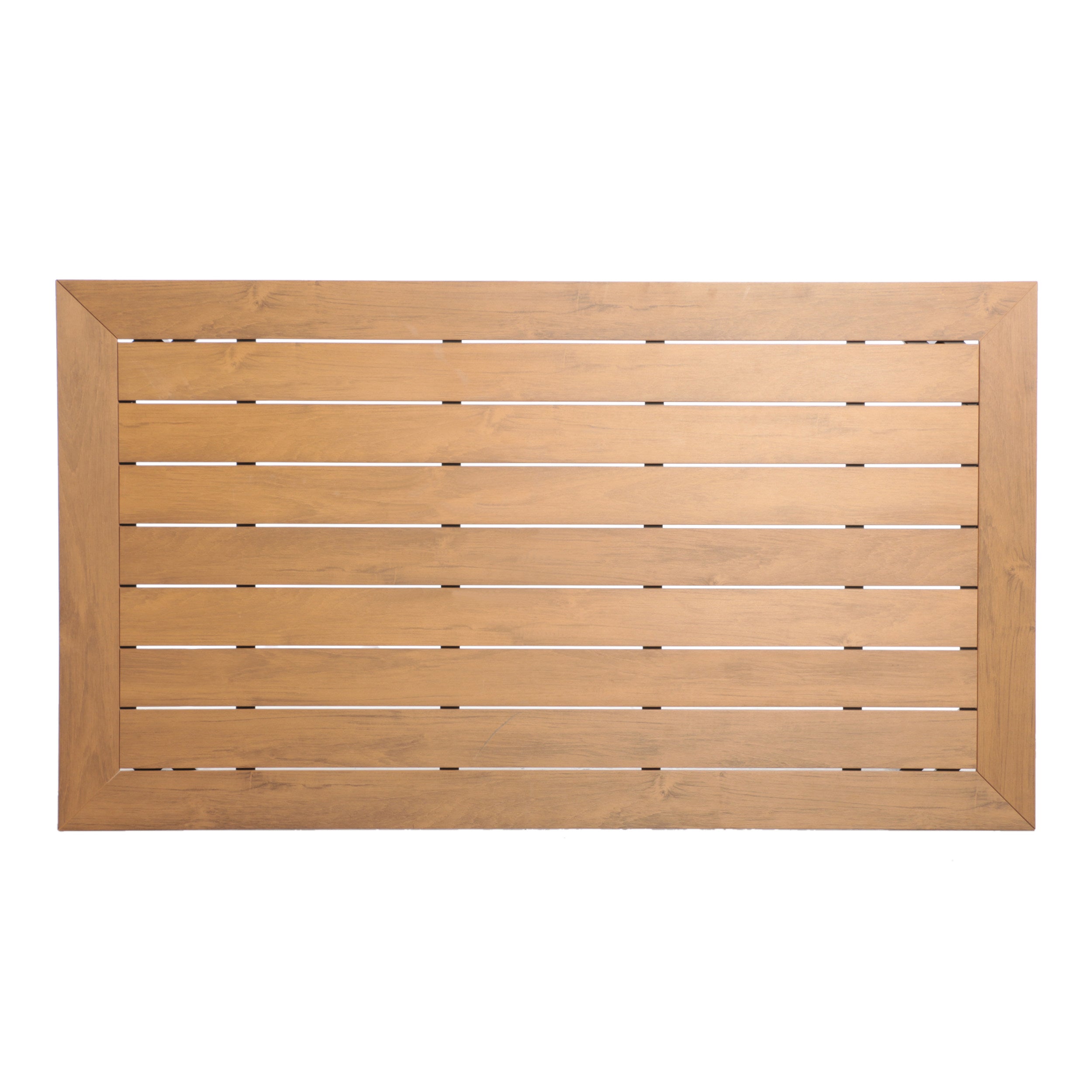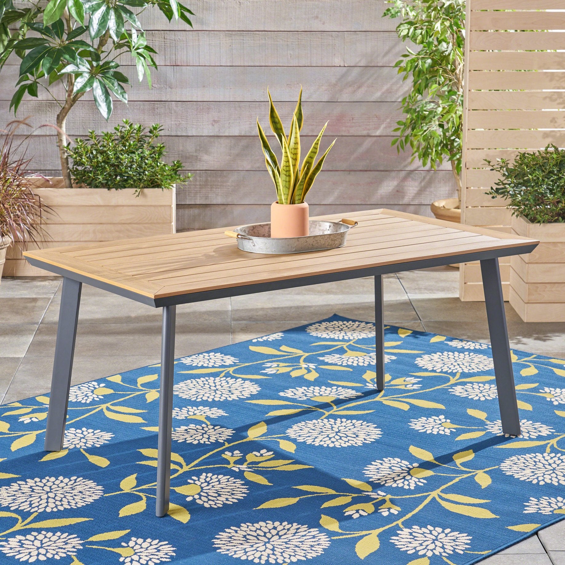- Update your at-home outdoor dining experience with a new place to break bread. This broad and expansive outdoor dining table is weather-resistant, easy to clean, and truly one of a kind. The sleekness of rust-resistant aluminum in combination with the look of genuine stained wood make this piece a must-have for any contemporary outdoor patio area.