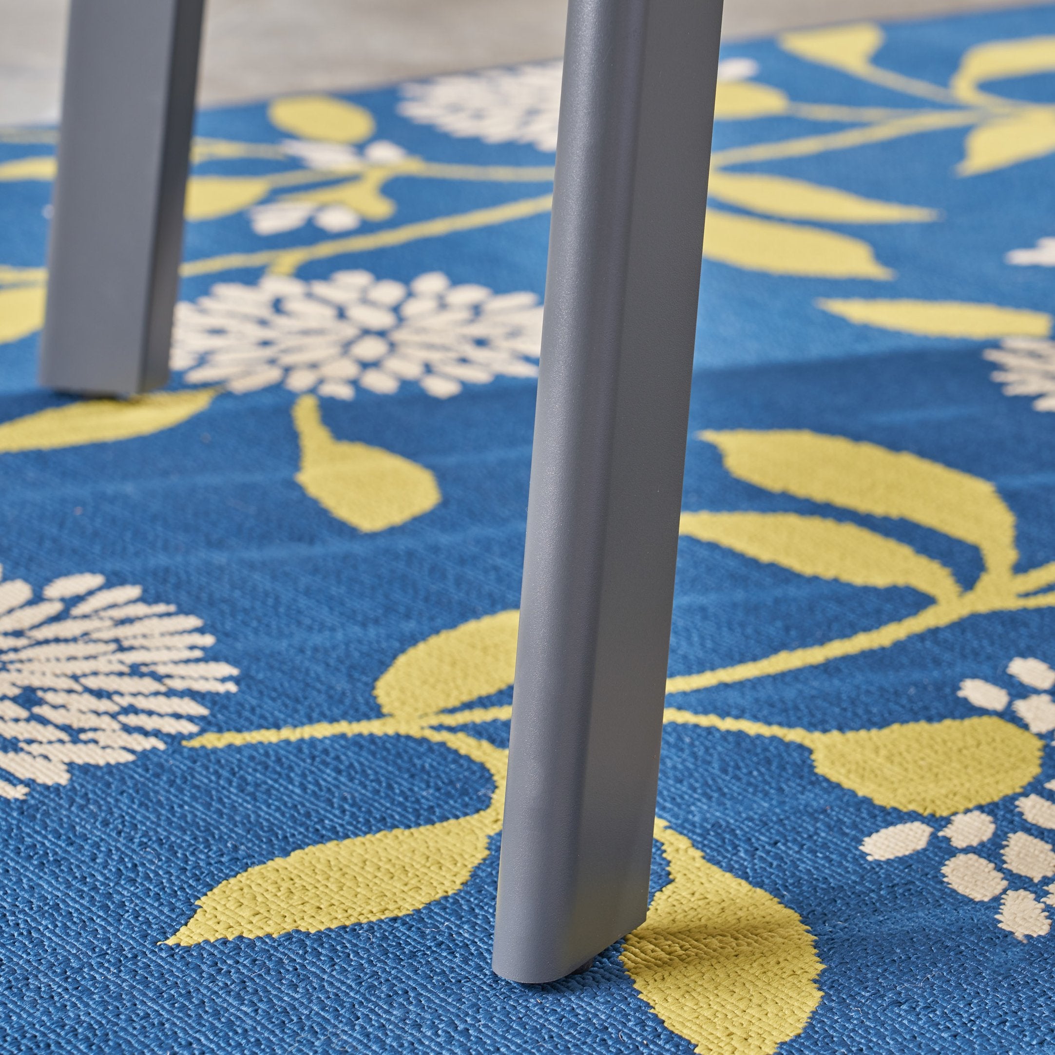 - Created with sturdy aluminum frames and striking wood finish accents, this set will comfortably seat up to six, allowing you and your guests to enjoy eating in the great outdoors.