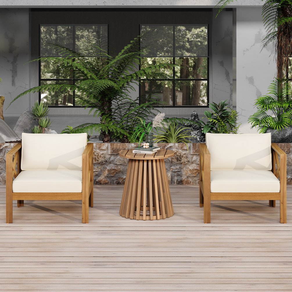 Bring relaxed, stylish comfort to your outdoor living area with this 2-seat patio conversation set. Crafted from durable acacia wood with a warm teak finish and paired with beige, water-resistant cushions, this set is engineered for everyday outdoor use while offering ergonomic seating and a compact side table for drinks or décor. Ideal for patios, balconies, decks, and small gardens, it blends low-maintenance construction with thoughtful comfort details so you can enjoy long, leisurely conversations outdoors.