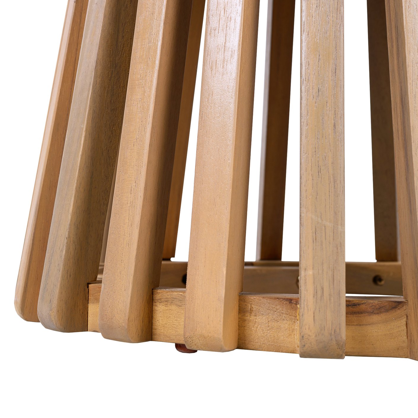 - Stylish Light Teak Side Table:The 15.75" diameter side table (17.75"H) in light teak boasts a unique base of interlocking wooden strips, combining visual appeal with sturdiness. It supports up to 81.12 lbs, providing a stable surface for drinks, books, or essentials beside the chairs.