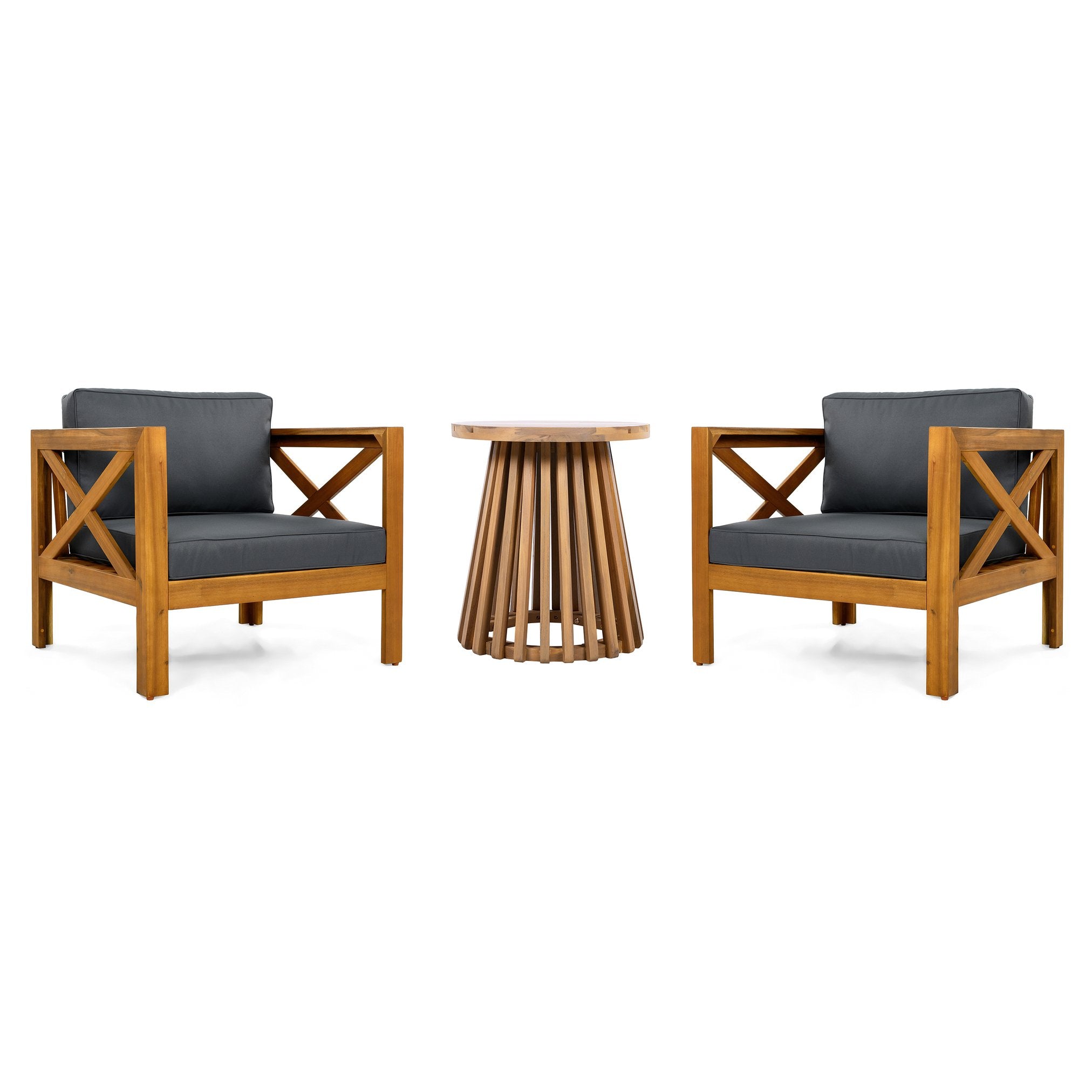 Refresh your outdoor living area with this elegant and durable patio conversation set—designed for relaxed gatherings and everyday comfort. Featuring two acacia wood club chairs with plush dark grey cushions and a light teak-finish side table, the ensemble blends classic styling with weather-ready materials for patios, balconies, decks, or gardens.