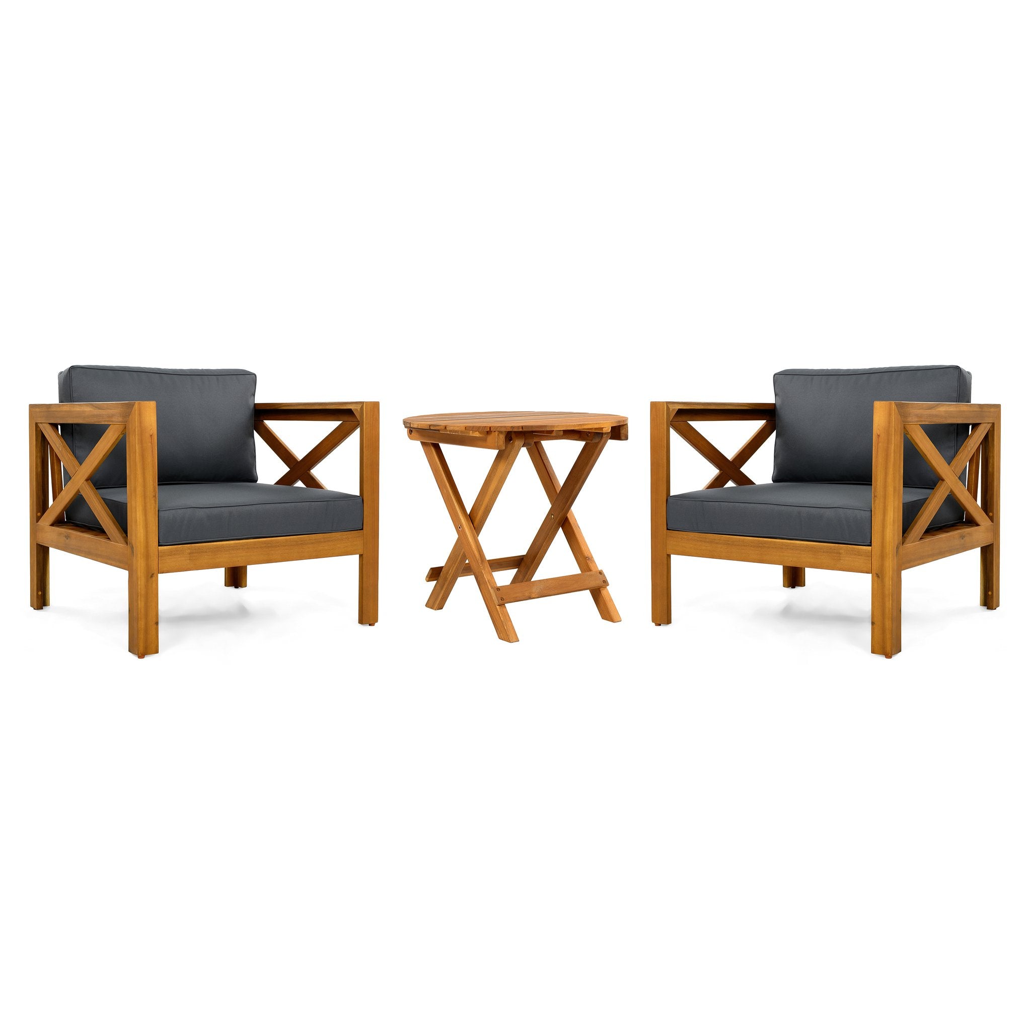Create a cozy, stylish outdoor conversation corner with this compact patio set—two acacia wood club chairs with plush dark grey cushions plus a foldable acacia side table in a warm teak finish. Built for everyday outdoor use, the set blends classic wood styling with practical, low-maintenance materials so you can relax, entertain, and store with ease.