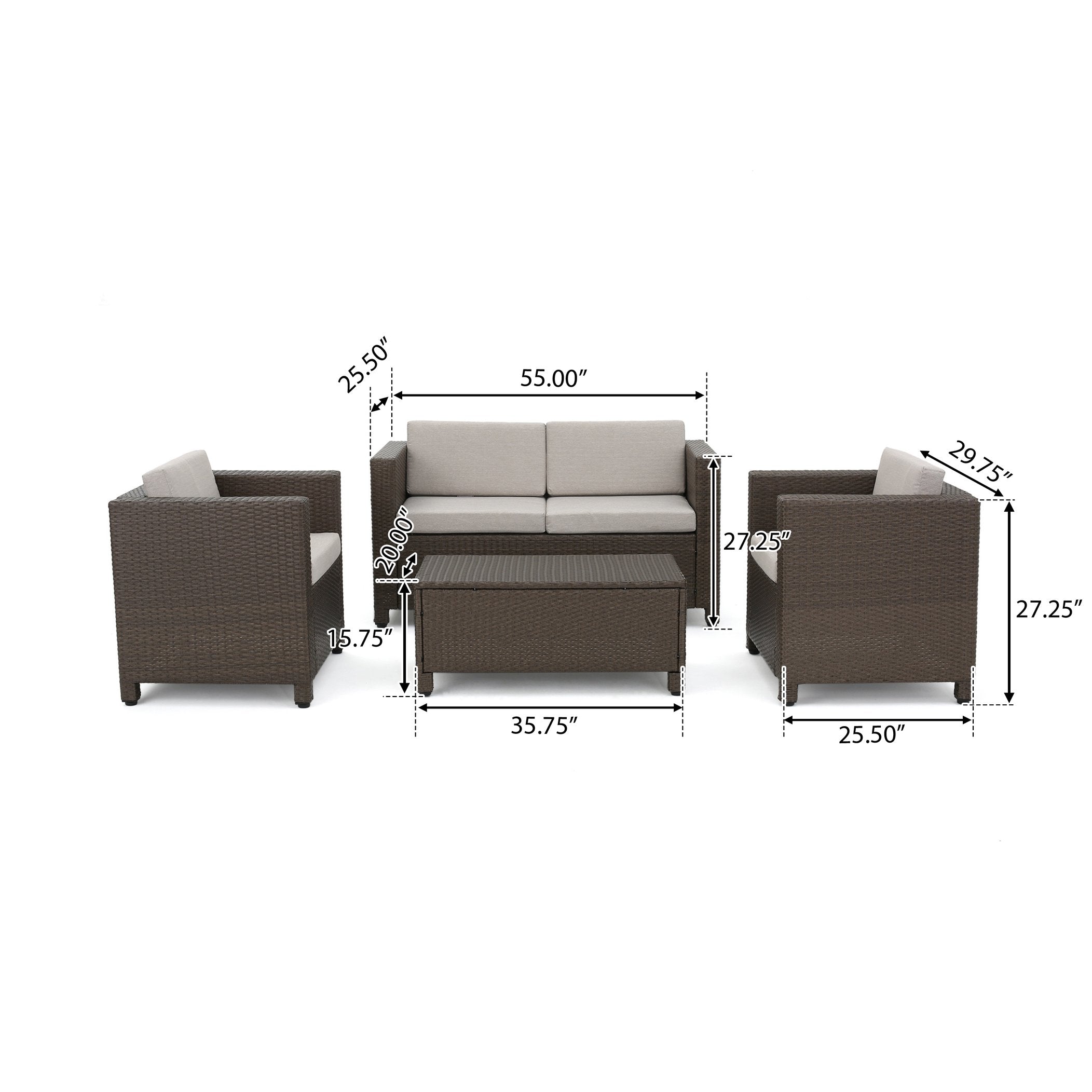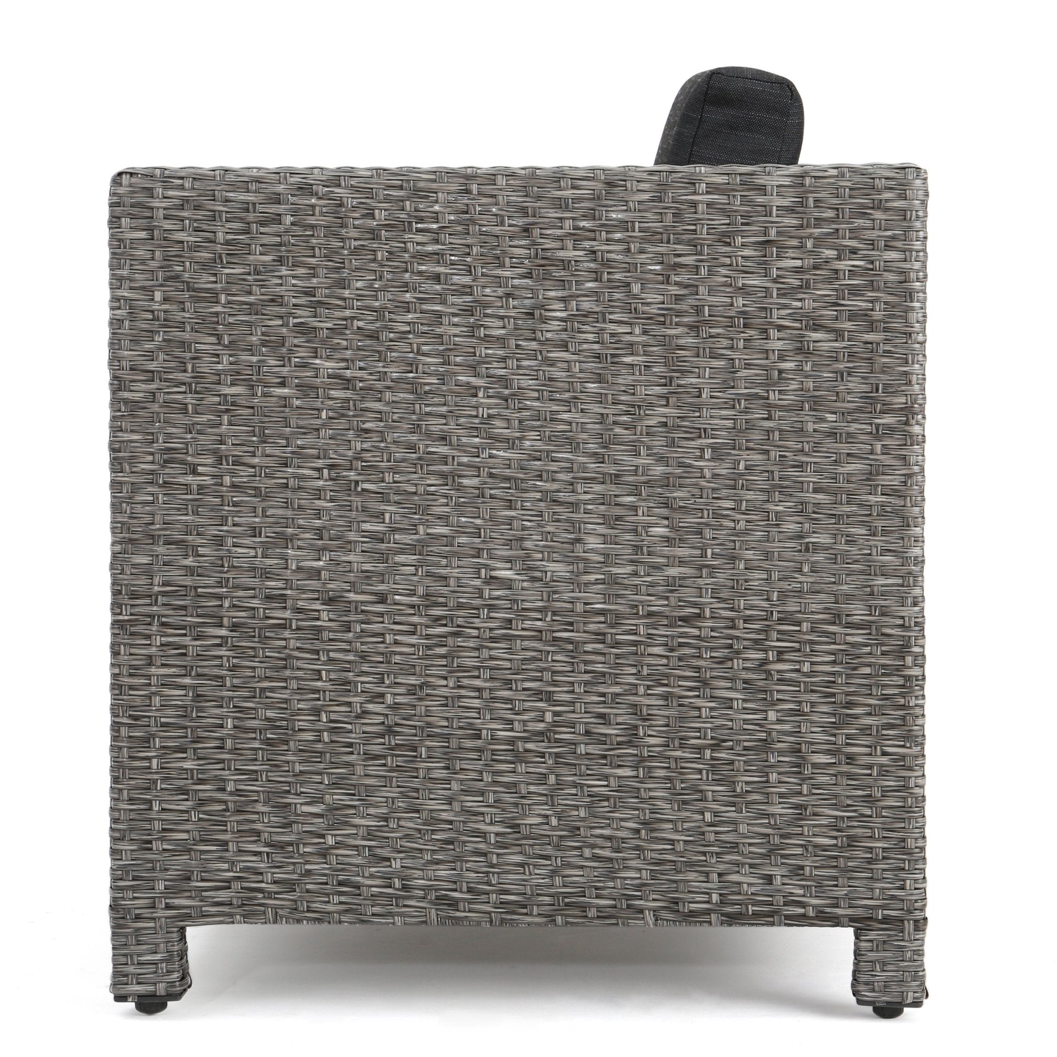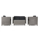 - Complete with one loveseat, two club chairs, and one rectangular coffee table, this seating group shows off PE wicker rattan wrapped around an all-weather, water-resistant iron frame.
