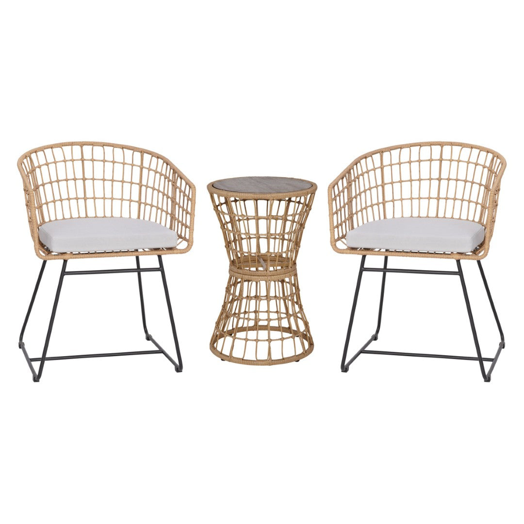 - Set Includes: Two woven polyethylene rattan rope chairs with cushions and one hourglass-shaped accent table with acacia wood top.