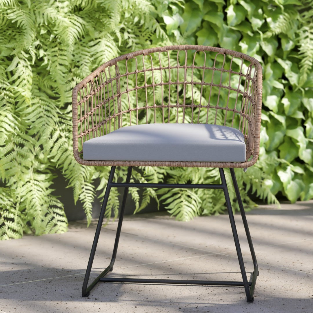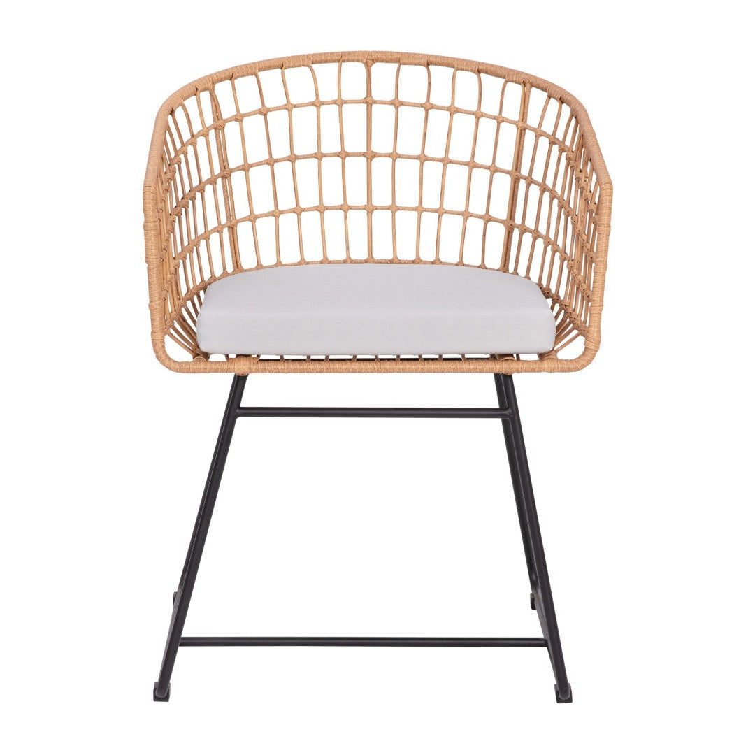 - Materials: Natural-finish woven polyethylene rattan rope, acacia wood tabletop, polyester fabric, foam cushions, and steel frames.