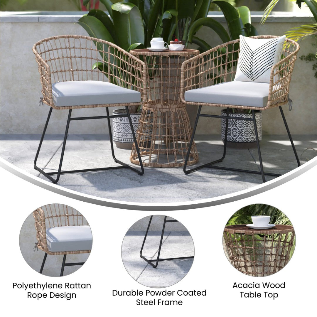 Enjoy relaxed, stylish conversations anywhere with this compact 3-piece bistro set designed for both indoor and outdoor living. The Devon set pairs softly rounded, woven rattan rope chairs with plush light-gray cushions and a warm acacia wood-topped accent table, creating a cozy boho aesthetic that’s durable enough for patios yet refined for interior use.