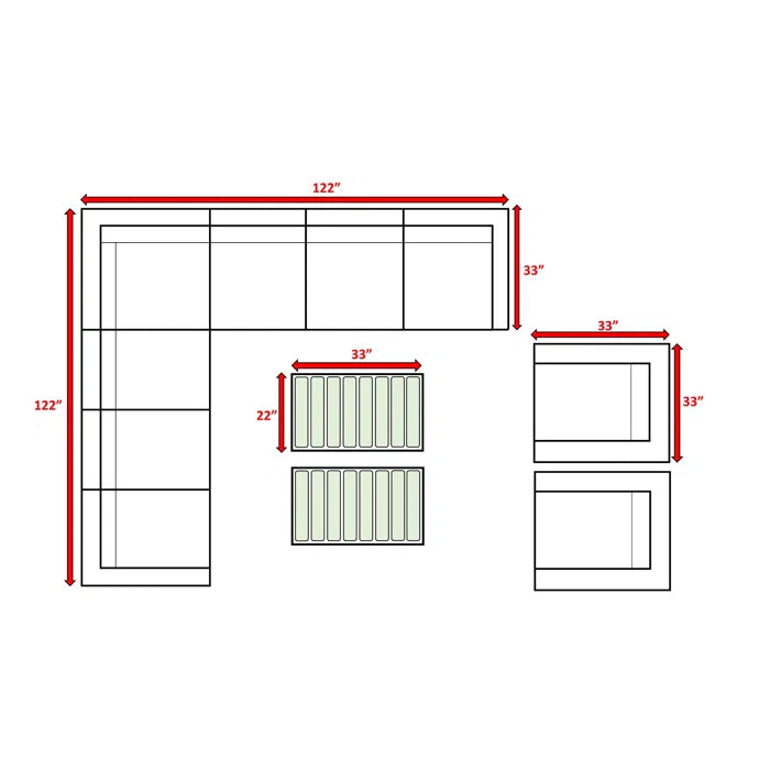 - Complete set: 11 pieces including 1 sectional, 1 sofa, 2 lounge chairs, 2 coffee tables, and 19 cushions—comfortably seats up to 8 people.