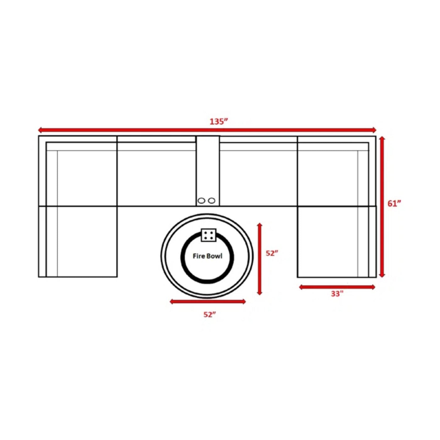 - Sofa: 26" H × 135" W × 61" D