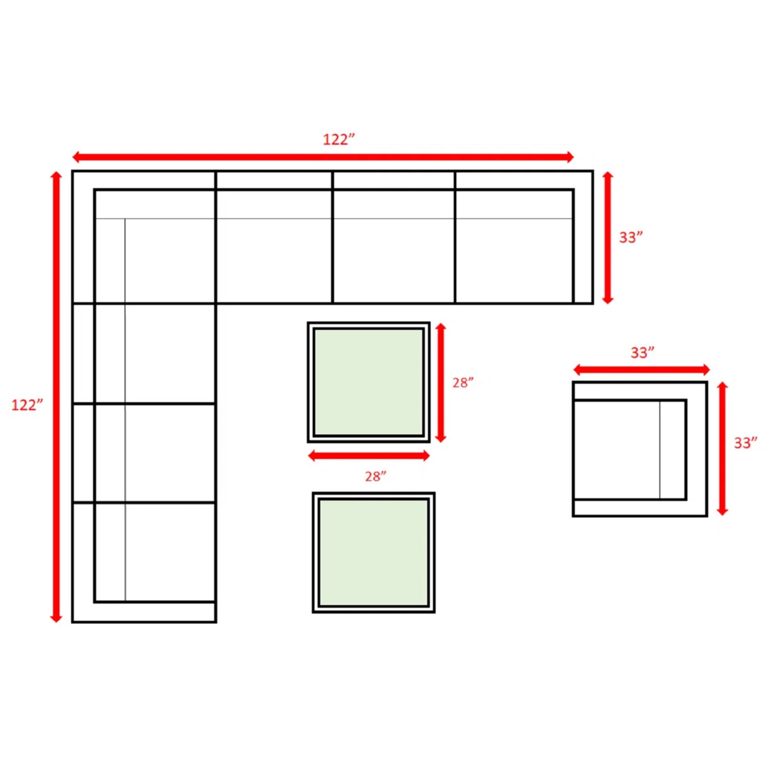 - Product dimensions (prominent): Overall listed dimensions: 29.92 L x 14.17 W x 29.92 H. Individual component dimensions as provided: Sofa: 122" W x 122" D x 26" H; Sectional: 33" W x 33" D x 26" H; Club Chair: 33" W x 33" D x 26" H; Tables (each): 28" L x 28" W x 13" H.