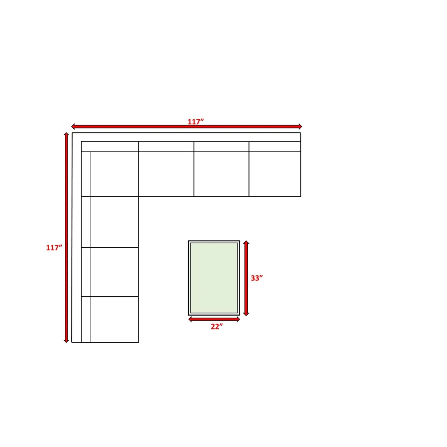 - Sofa: 26" H x 117" W x 117" D