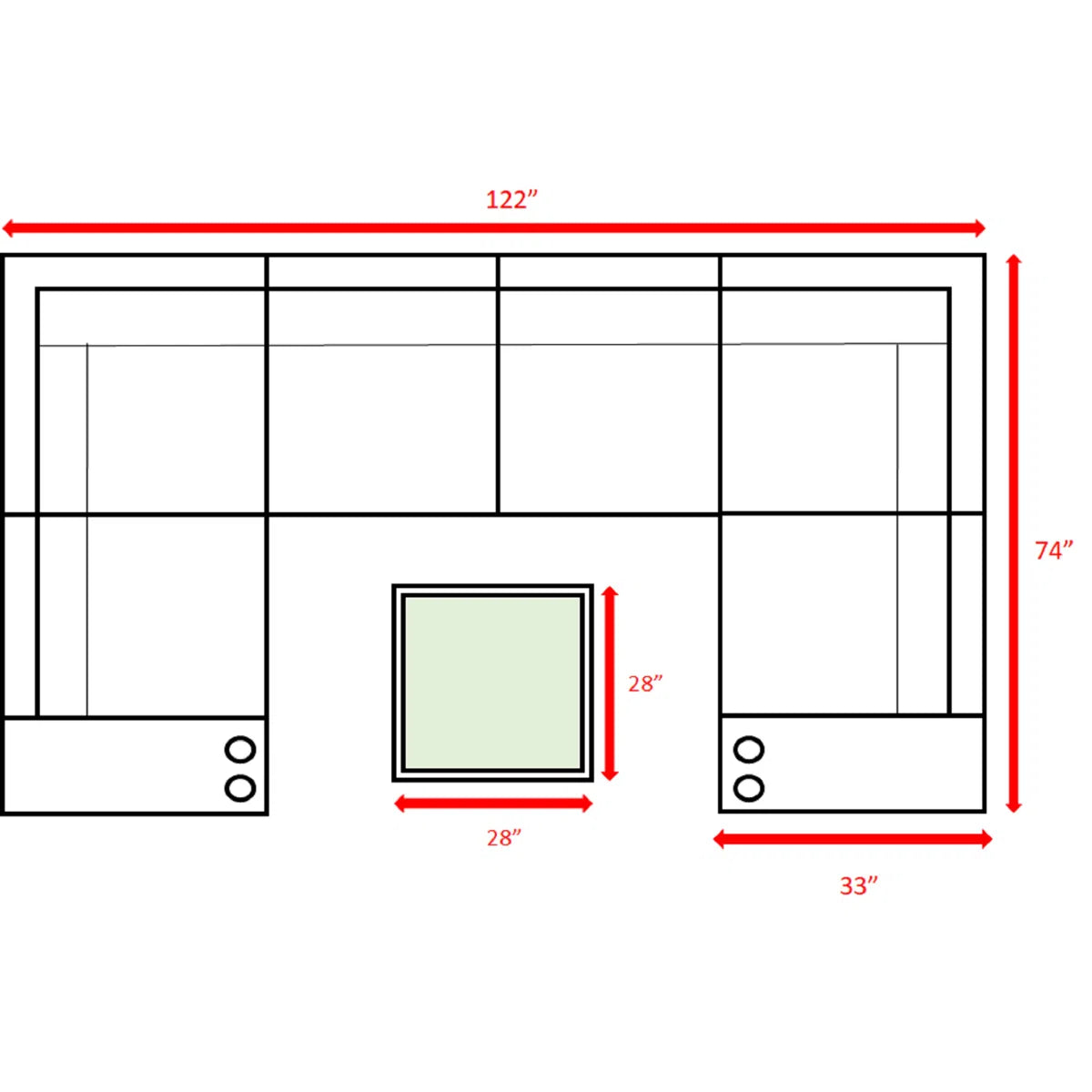 - Key dimensions (prominent): Sofa: 122" W x 74" D x 26" H; Coffee table: 28" L x 28" W x 13" H; Overall product dimensions: 33.86" L x 27.56" W x 33.86" H.