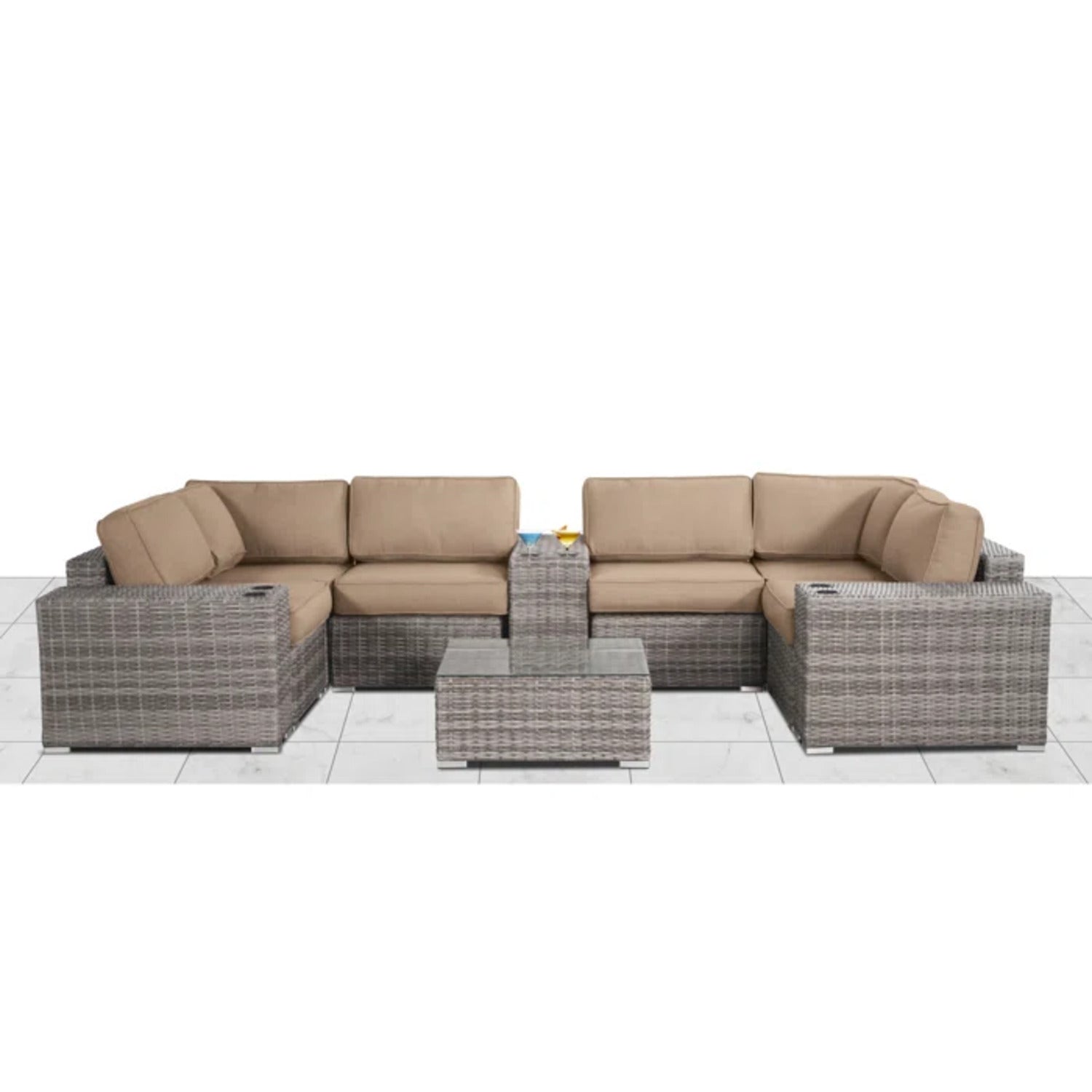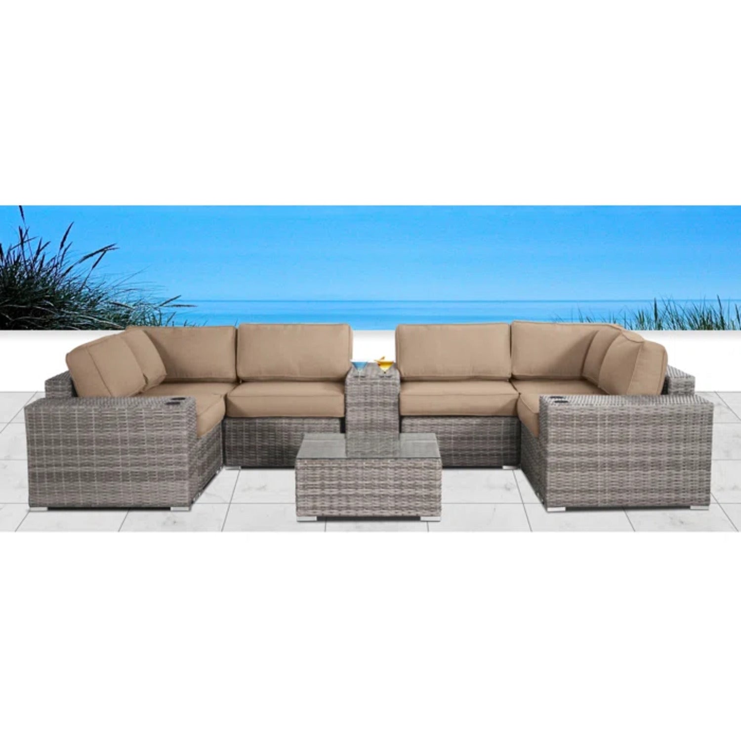 - Complete 10-Piece Outdoor Set: Includes 1 sofa, 2 sectionals, 1 lounge chair, 4 cup tables, and 14 cushions
