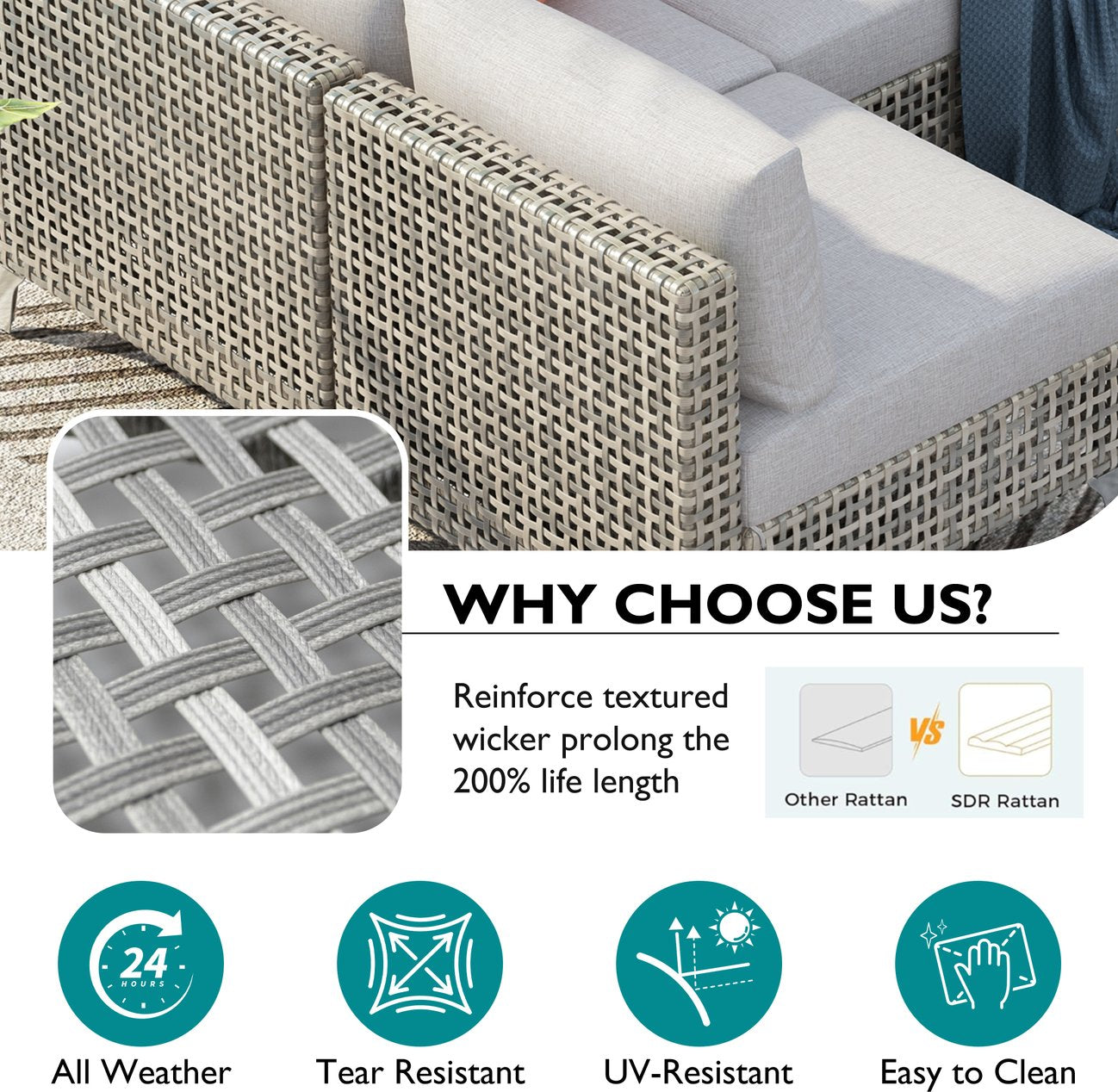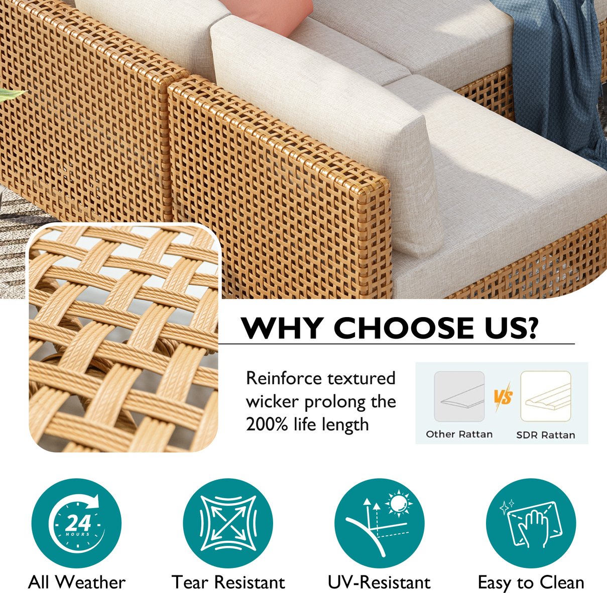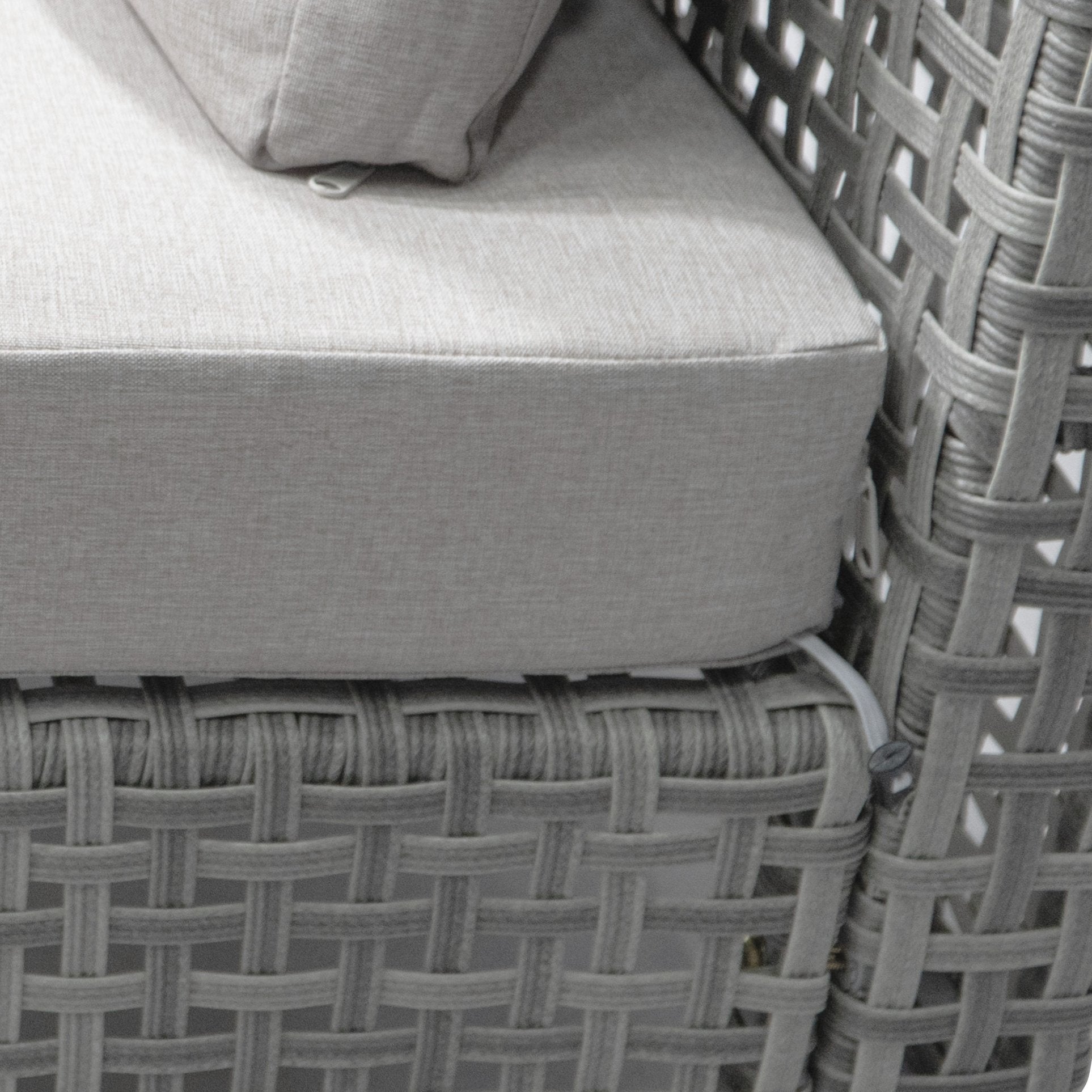 - Comfortable, weather-resistant cushions: 4" thick seat cushions and 7.1" thick back cushions with water-repellent, UV-protected Poly-CD fabric; zippered, removable covers for easy washing and anti-slip clasps to keep cushions in place.