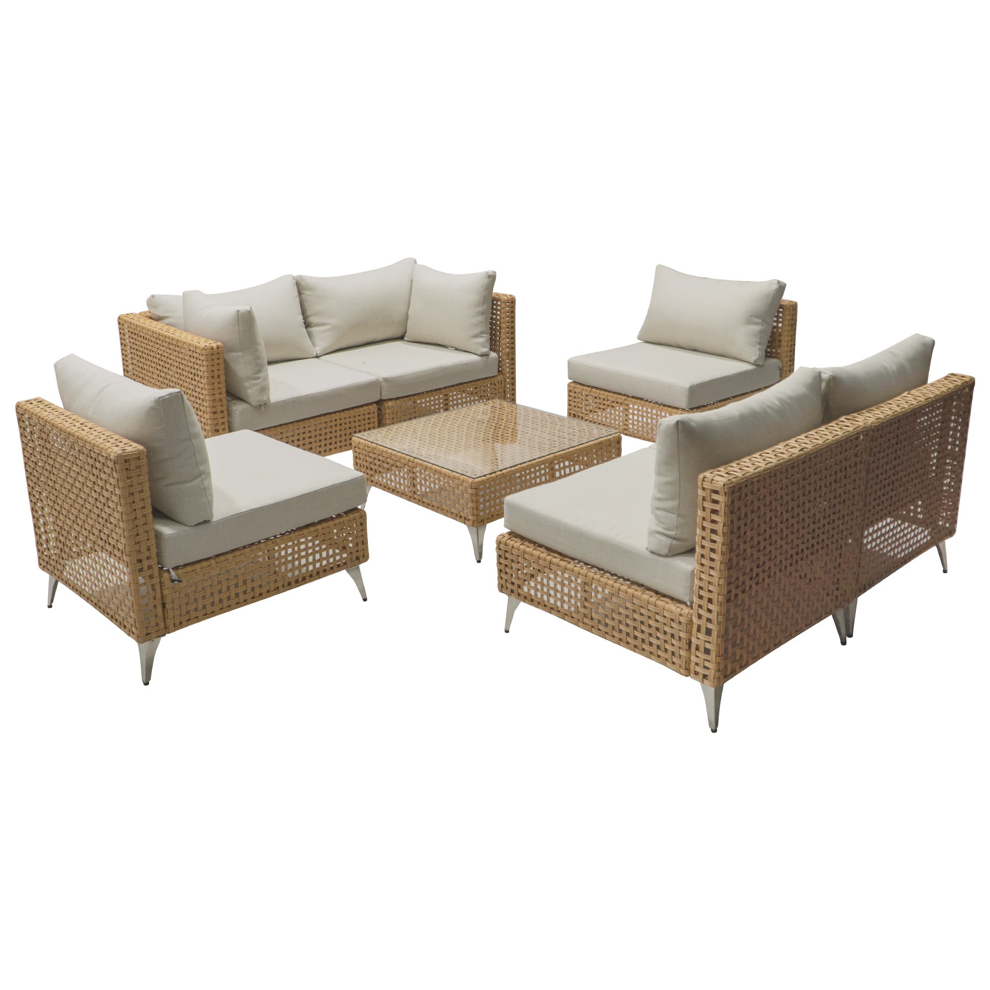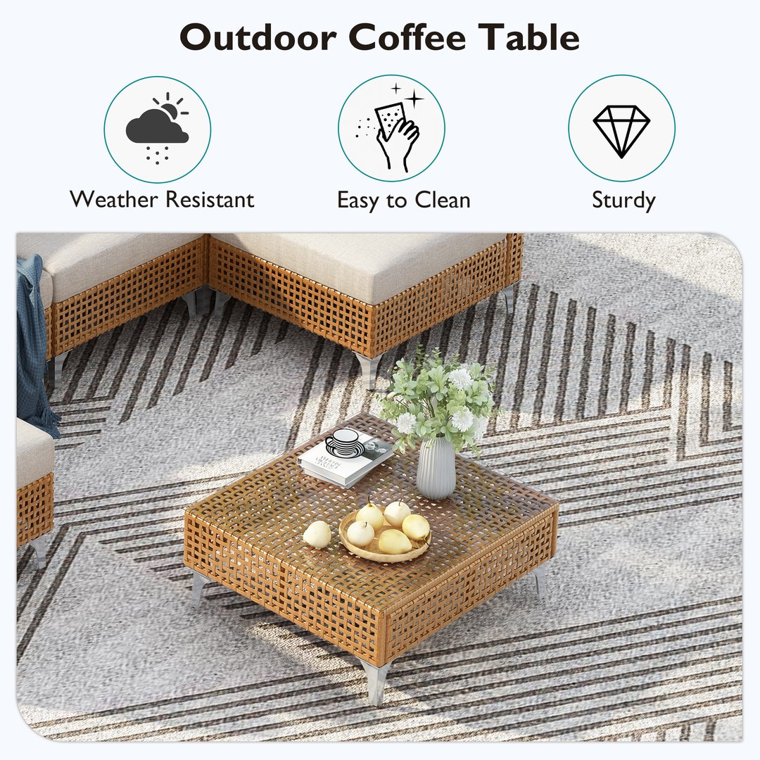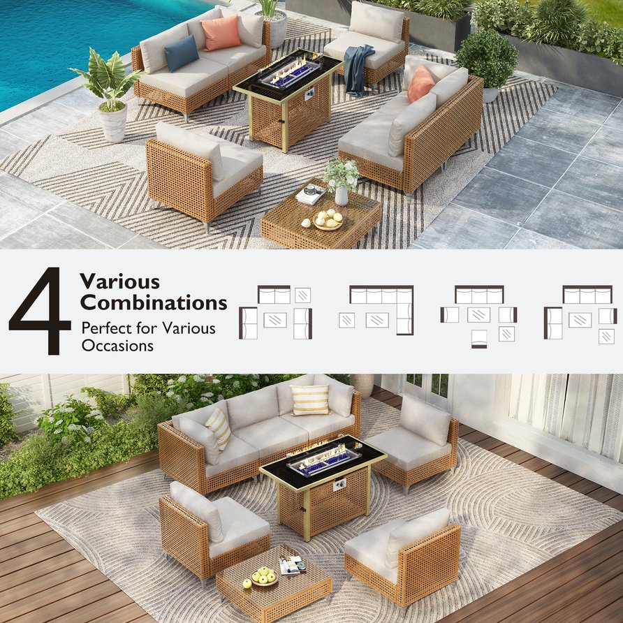- [Bohemian Design] Featuring beige cushions and matching orange wicker, this patio sofa set flaunts a modern neutral color combination. Its modular sofa design enables you to customize the seating arrangement and securely lock them together. The outdoor fire pit showcases all-weather black tempered glass with an open basket-wave patterned wicker, accentuating its natural texture and seamlessly complementing the flame. With its boho and beach style, this set blends with any home decor.
