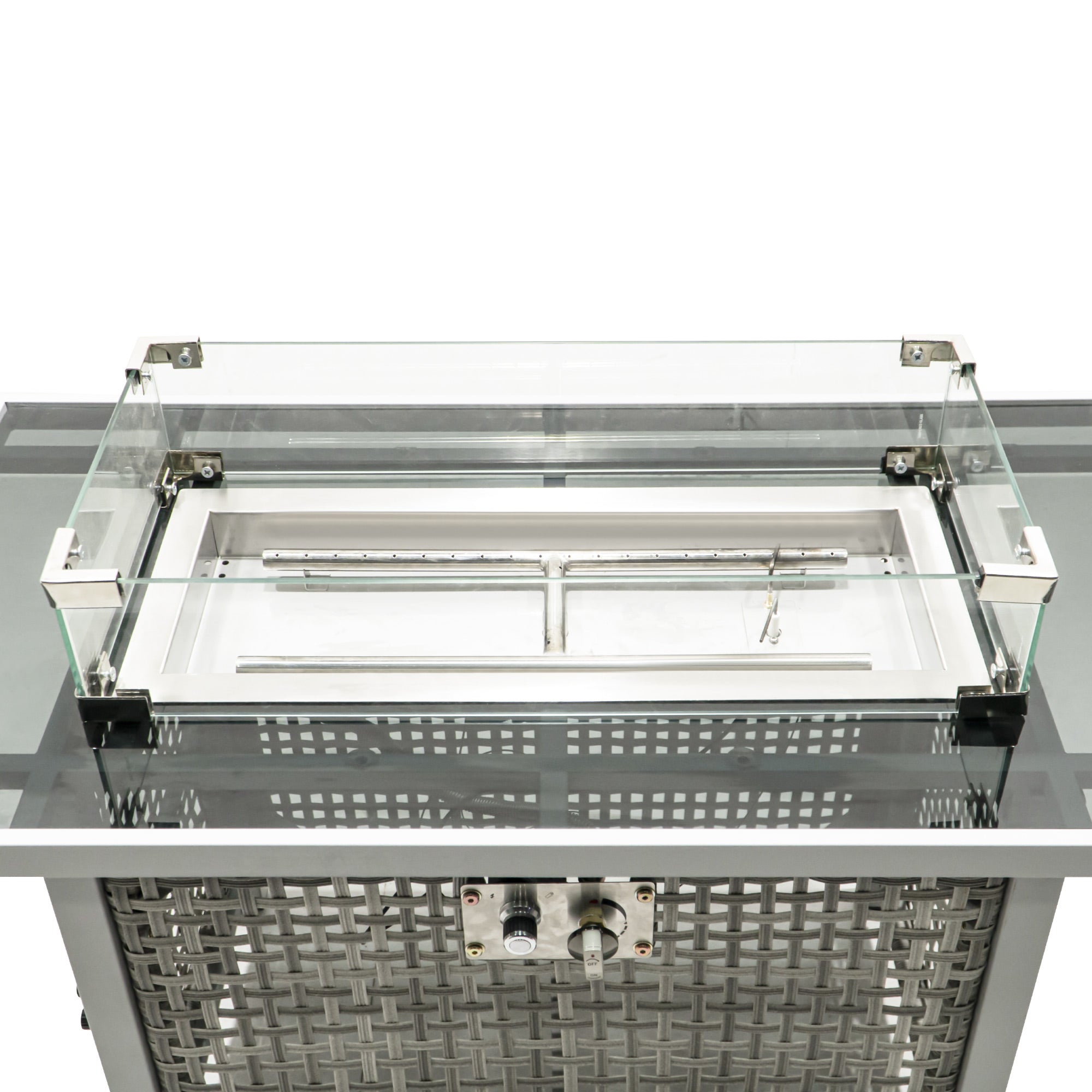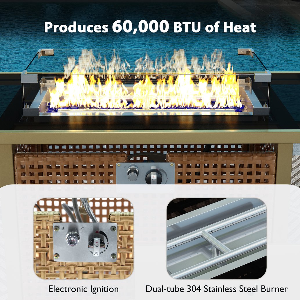 - Tempered glass surfaces: Coffee table and fire pit incorporate clear tempered glass for a sleek look that’s easy to clean; fire pit includes a glass wind guard for flame protection and visibility.