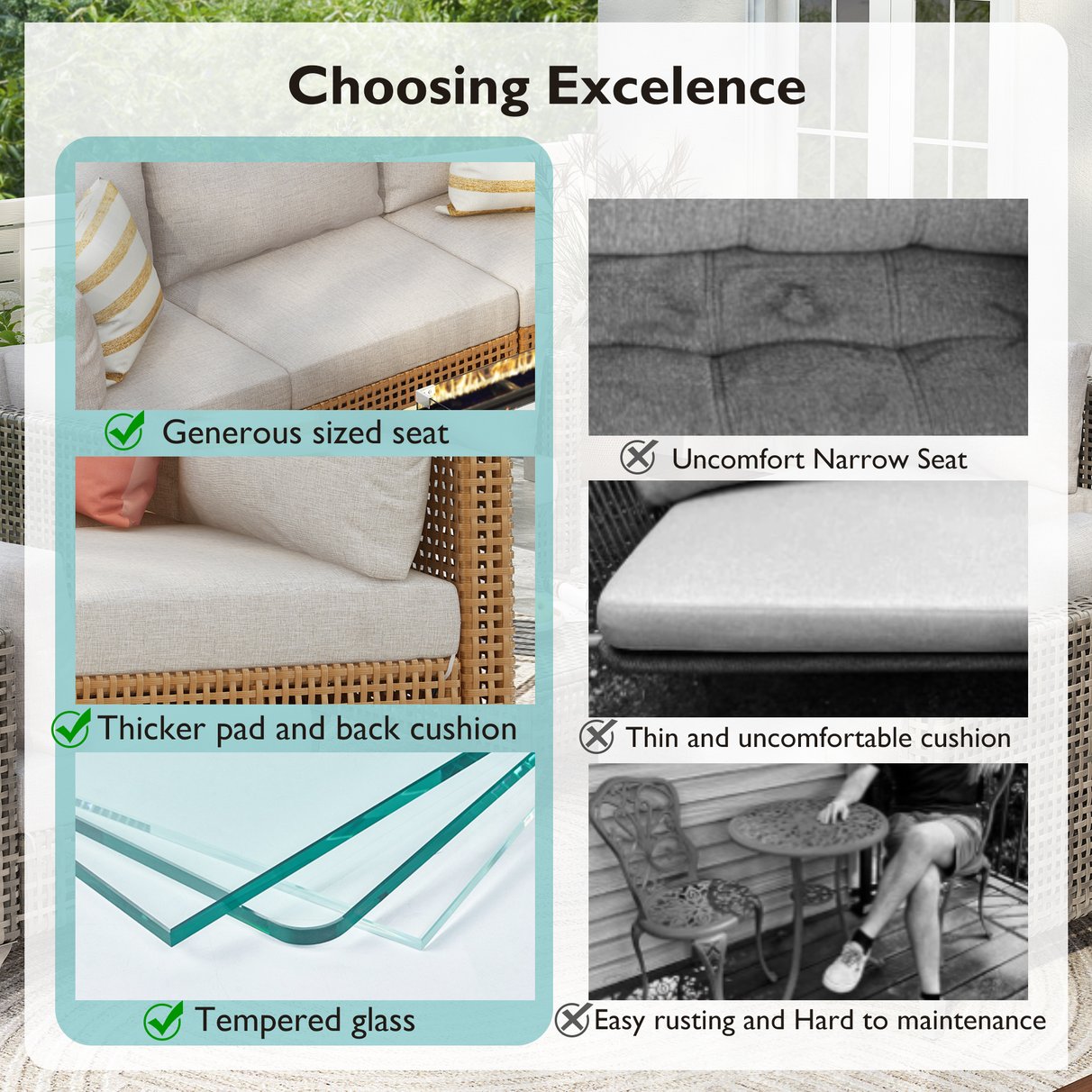 - [Deep Seat & High Quality Cushion] Crafted from outdoor cushion covers fabricated with high-quality 180g/㎡Poly-CD fabric, these cushions are resistant to UV-rays and stains, offering durability compared to standard polyester. The 4''seat cushions and 7.1''back cushion in this 8-piece outdoor conversation set provide outstanding support, reducing fatigue and enabling you to relax comfortably for extended periods. Additionally, the removable cushions with smooth zippers facilitate cleaning easily.