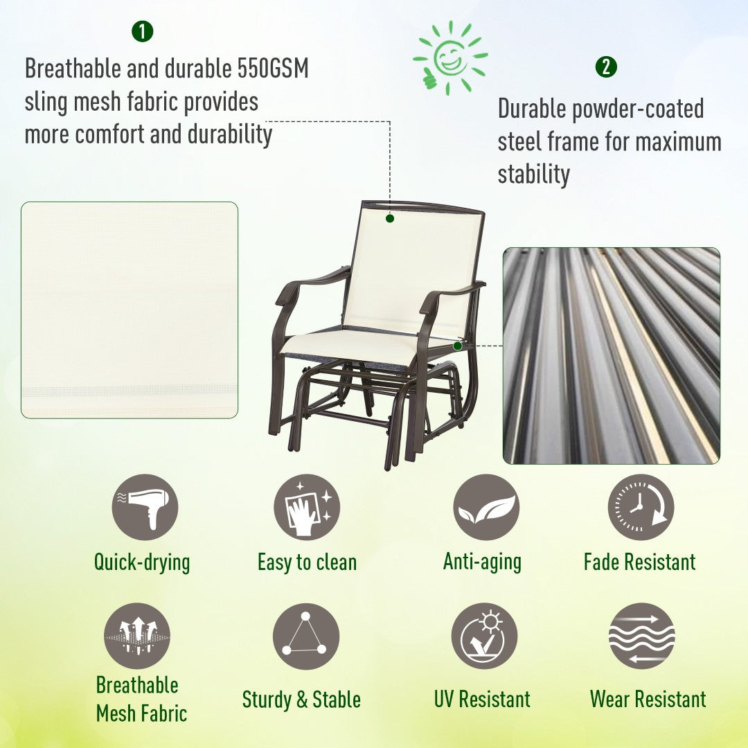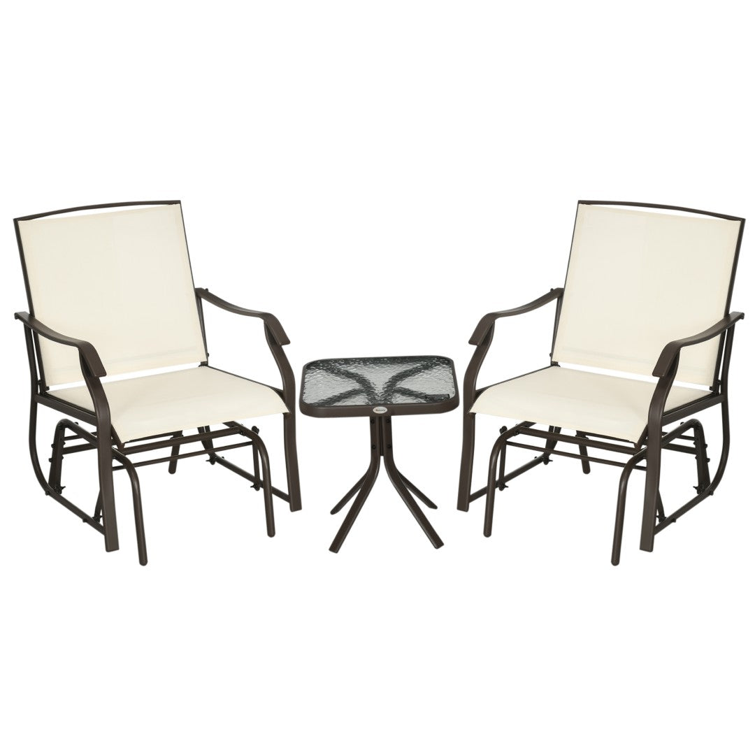 Enjoy relaxed conversations and quiet mornings outdoors with this stylish 3-piece bistro glider set. Designed for comfort, durability, and low maintenance, the set includes two breathable sling glider chairs and a compact glass-top side table—perfect for balconies, porches, patios, and gardens. The contemporary cream-white finish complements a wide range of outdoor décor while powder-coated steel and quick-dry mesh ensure season-ready performance.
